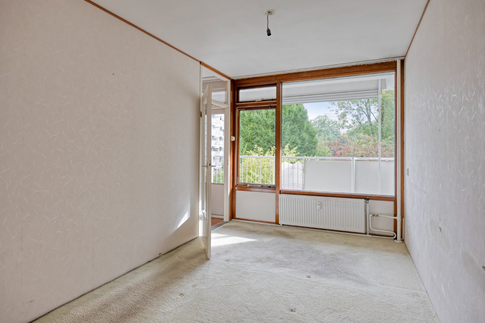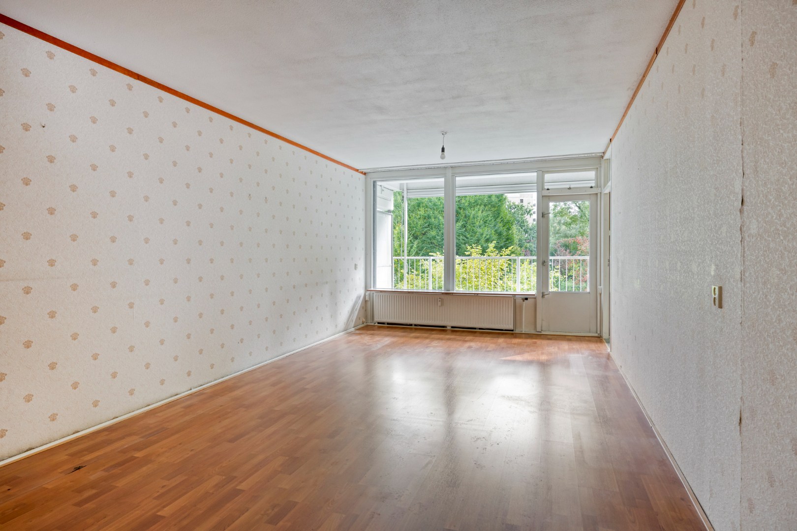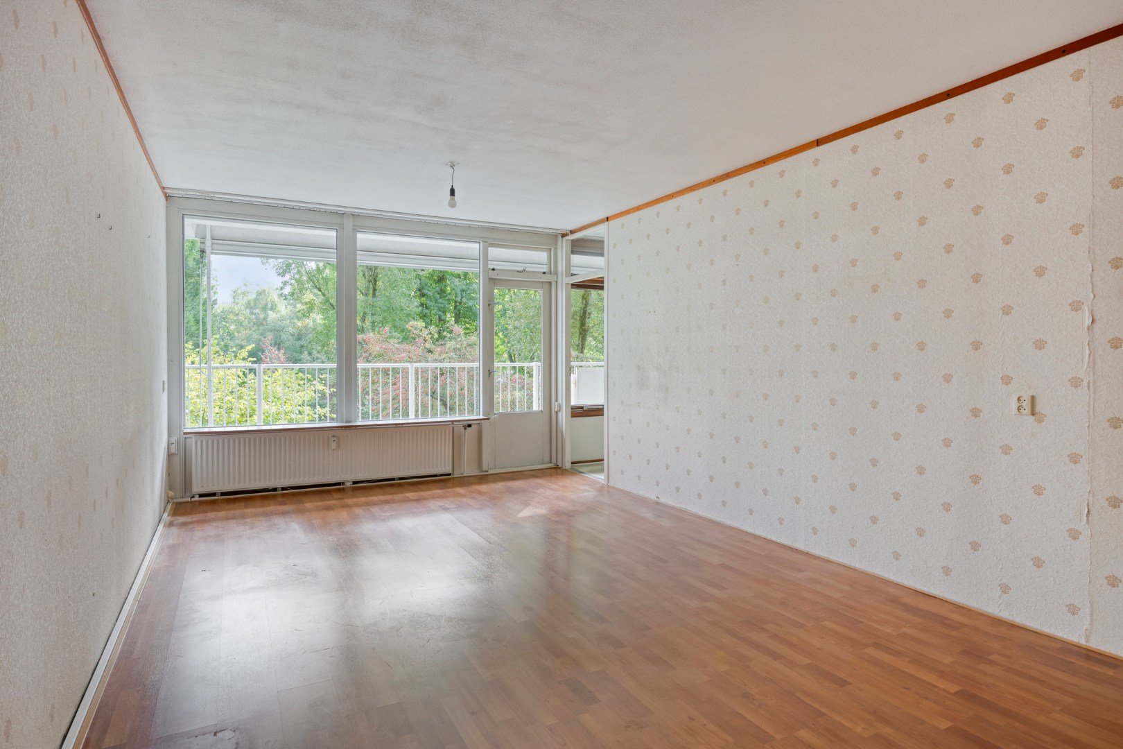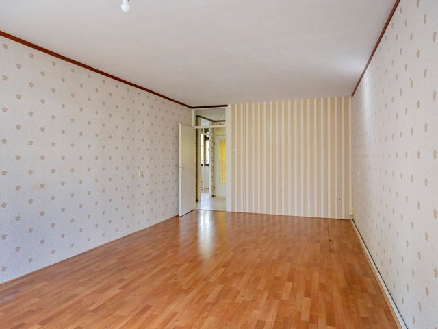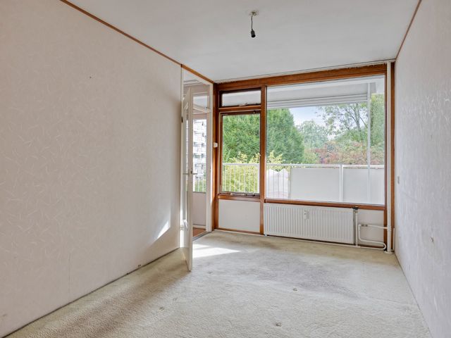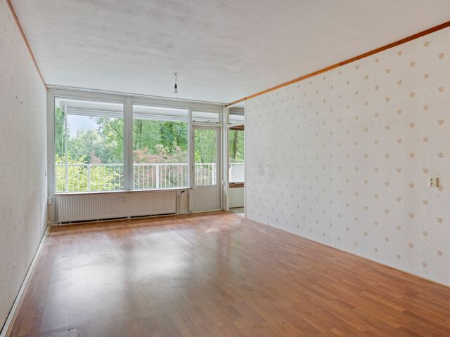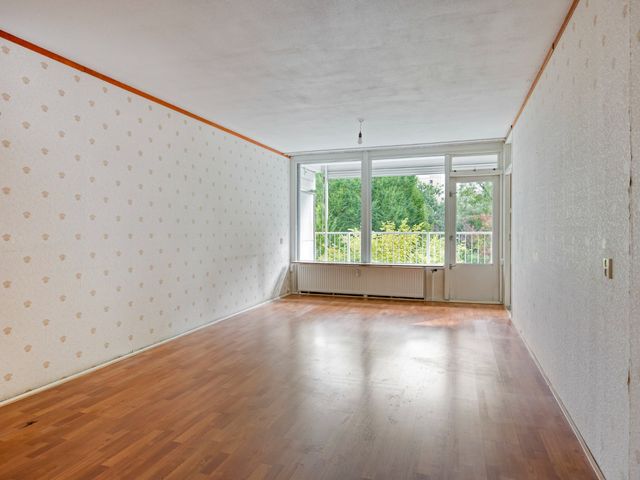Lichte woonkamer voorzien van een laminaatvloer en toegang tot de slaapkamer en het zonnige balkon welke gelegen is op het zuiden.