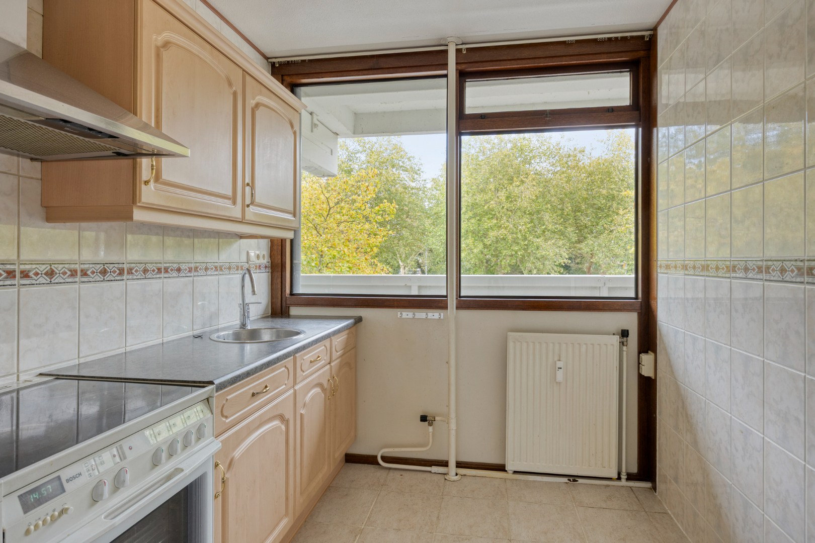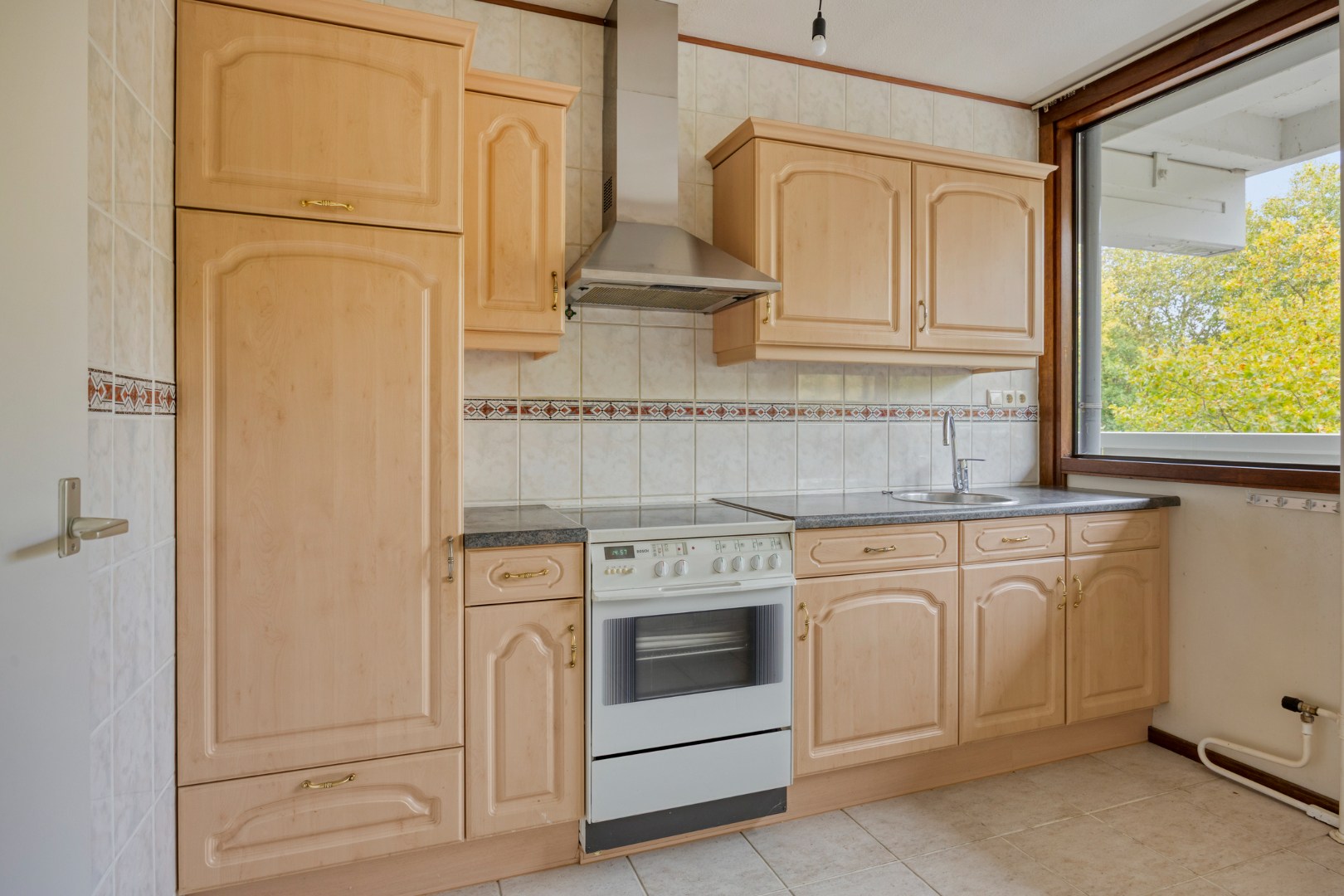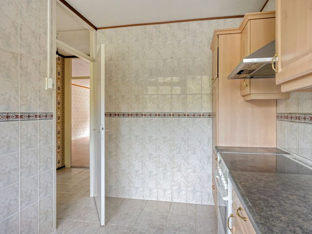 Bij binnenkomst rechts vindt u de keuken met keukenblok in een rechte opstelling en is voorzien van apparatuur zoals; koel-/vriescombinatie, kookplaat, oven en rvs-afzuigkap.