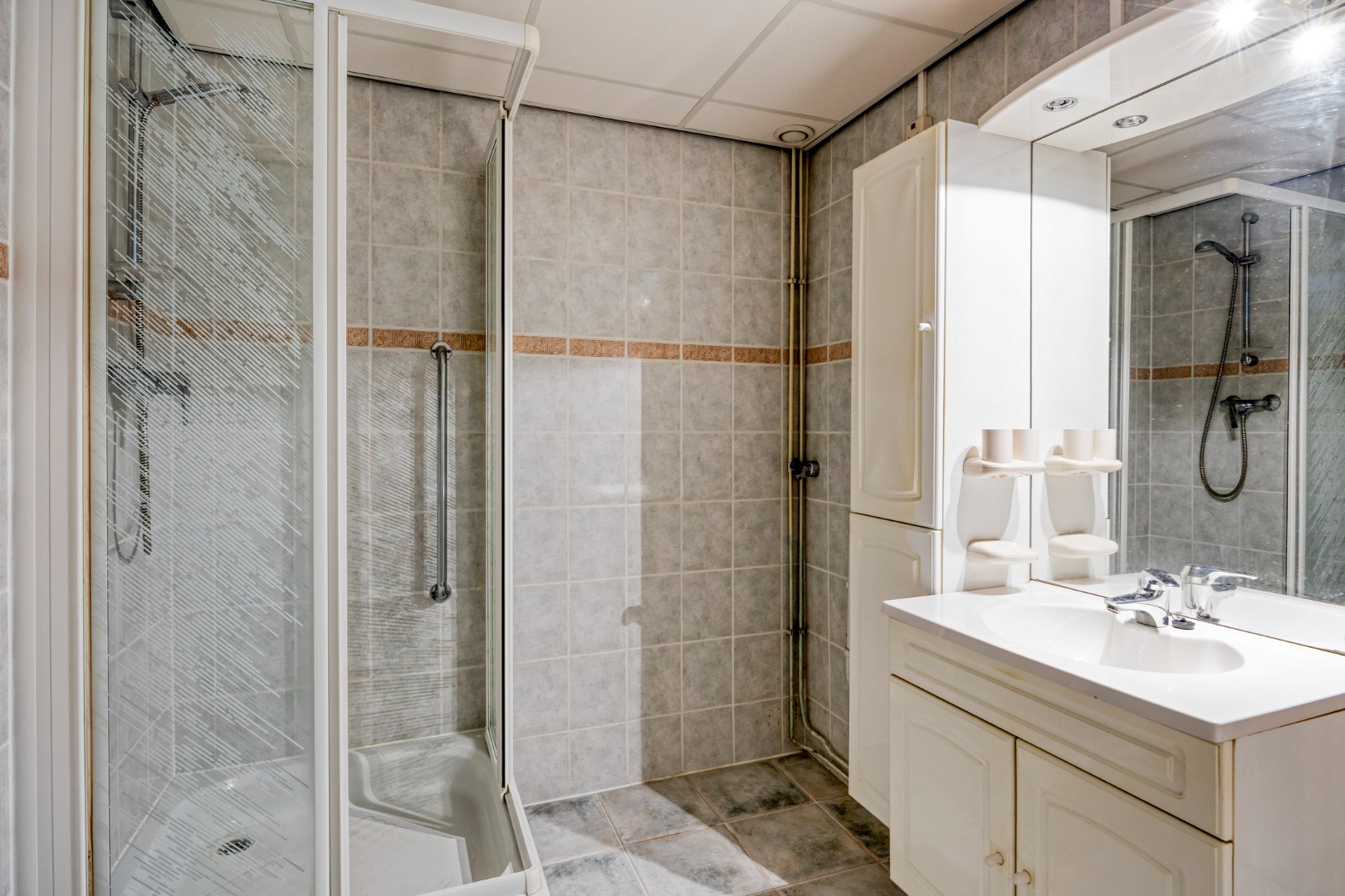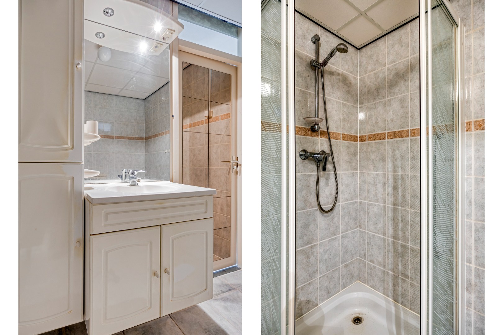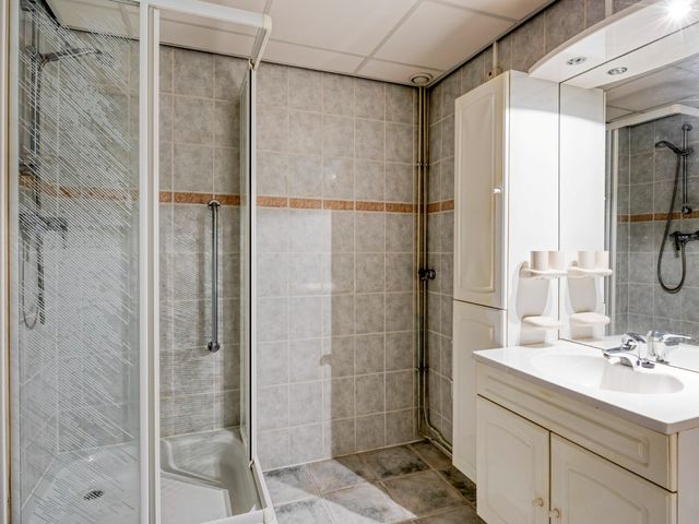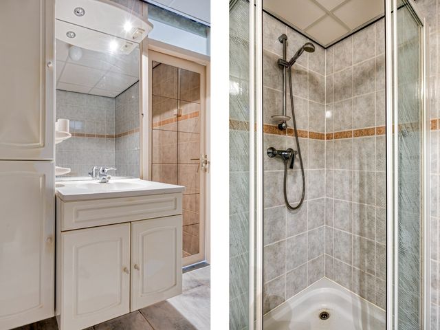 De badkamer is geheel betegeld en beschikt over een douchecabine met handdouche, wastafelmeubel en opbergkasten. Tevens is hier ook de aansluiting voor de wasmachine en/of droger.