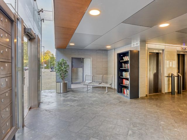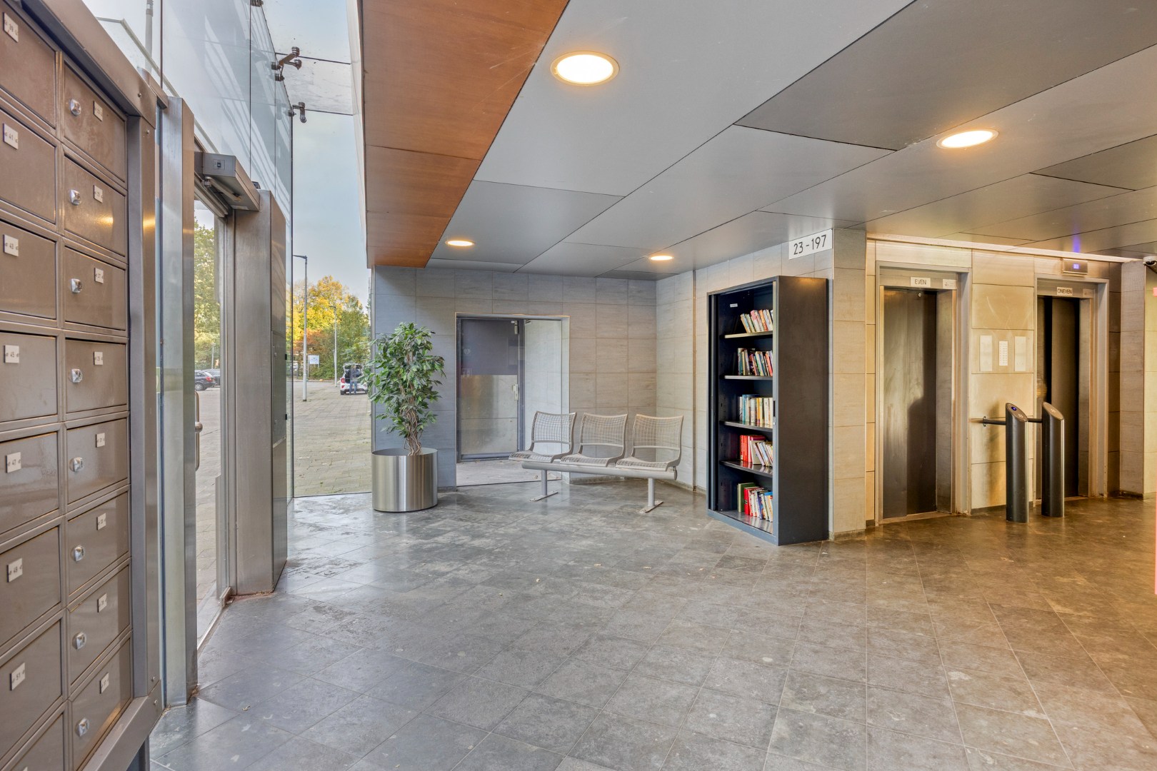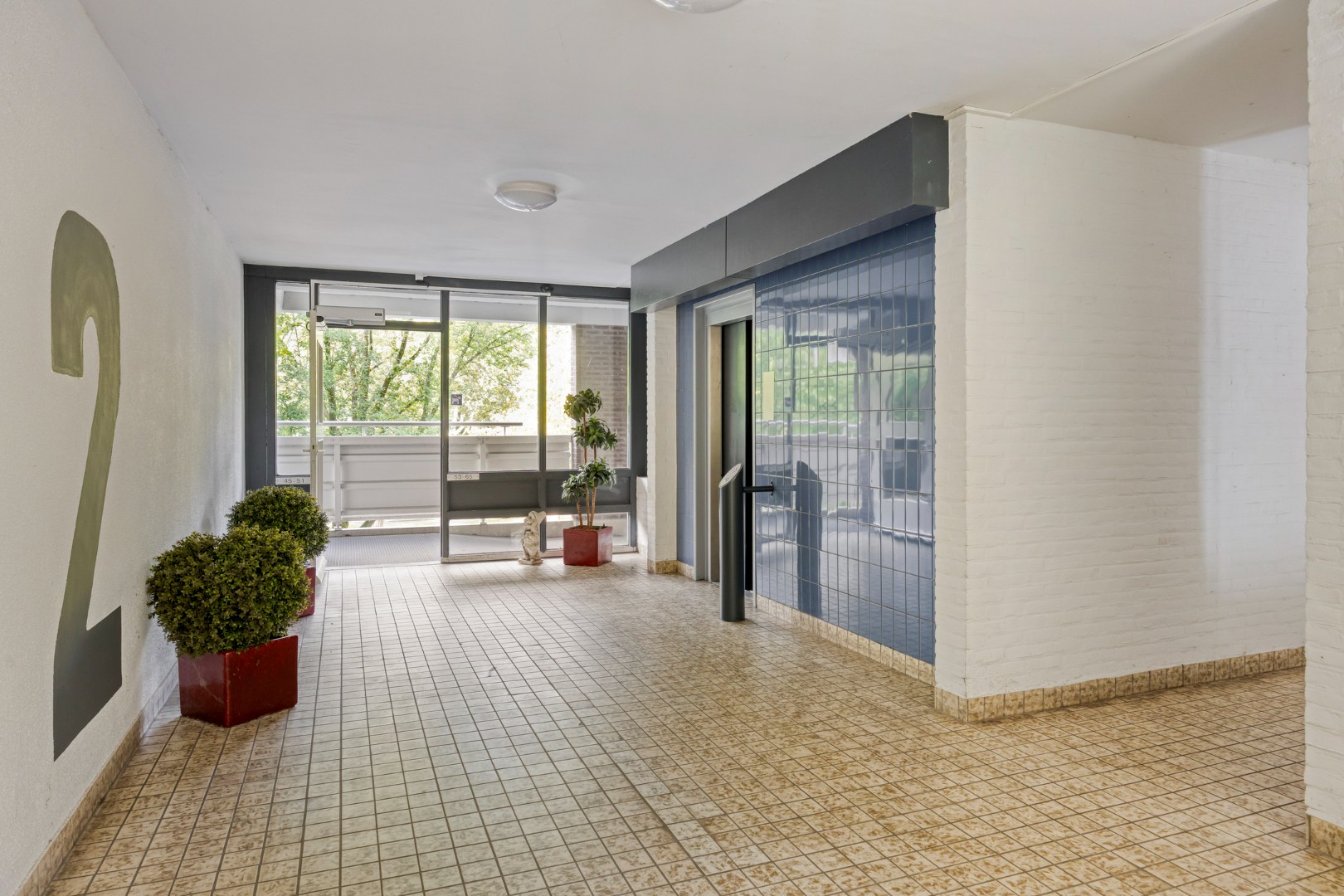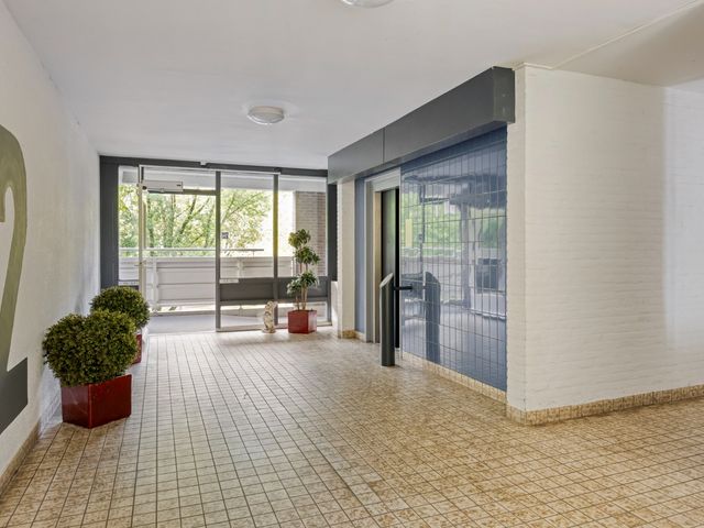 Afgesloten entree, bellentableau en brievenbussen. Toegang tot de liften en bergingen.