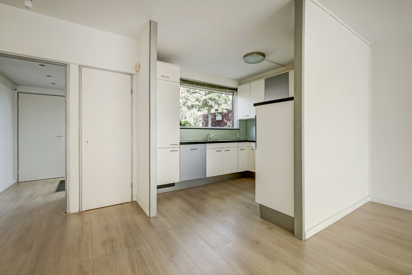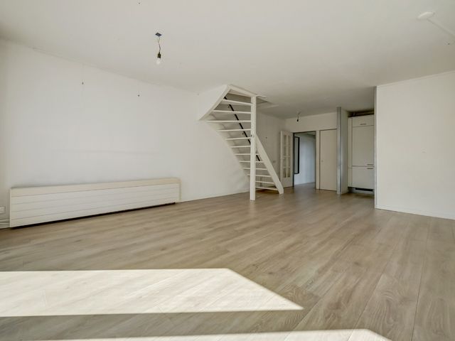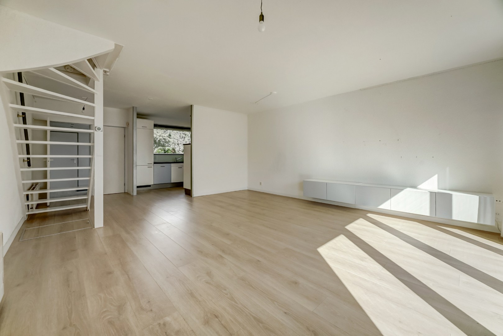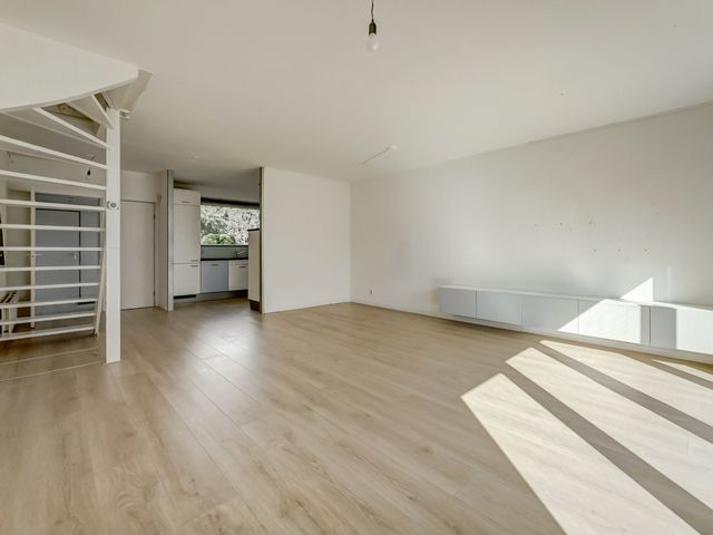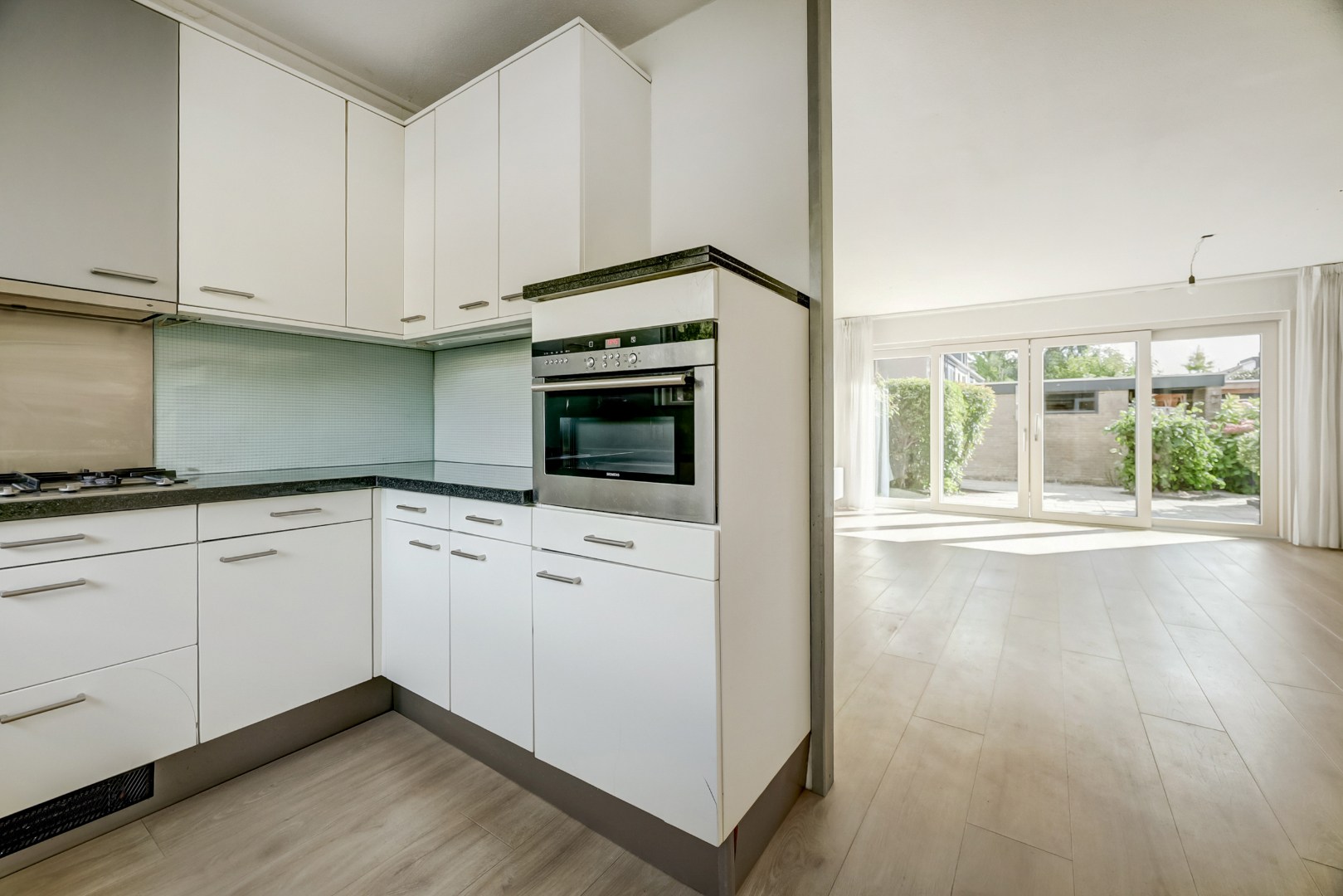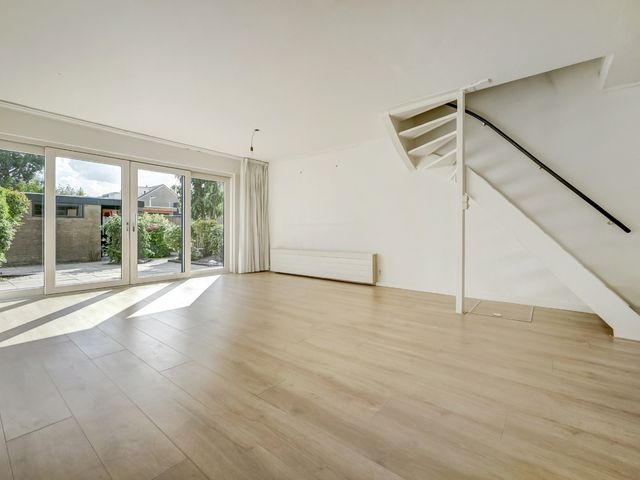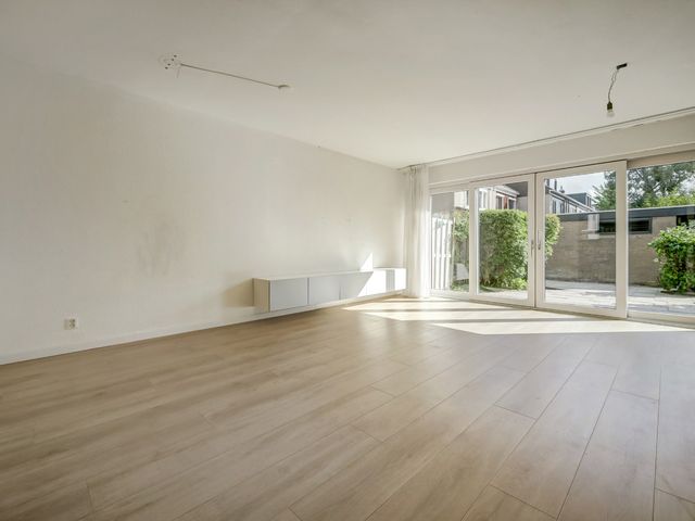 De ruime en lichte woonkamer is tuingericht en beschikt over een grote schuifpui naar de achtertuin, wat zorgt voor veel daglicht en een prettige verbinding tussen binnen en buiten.
