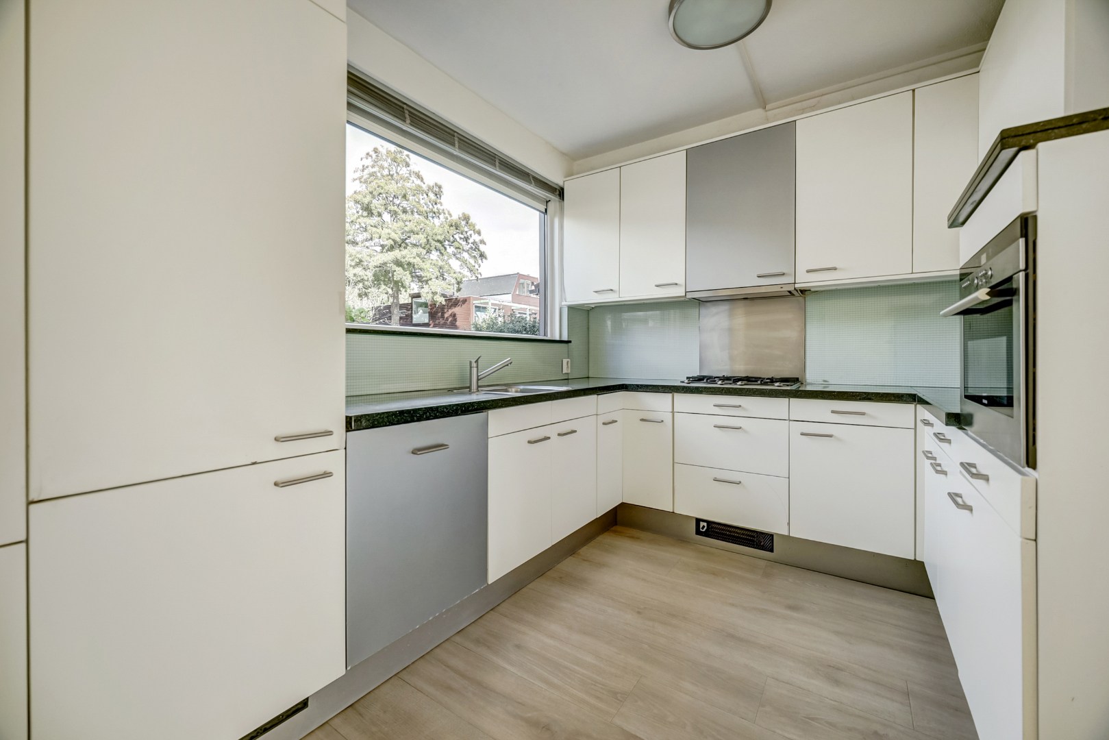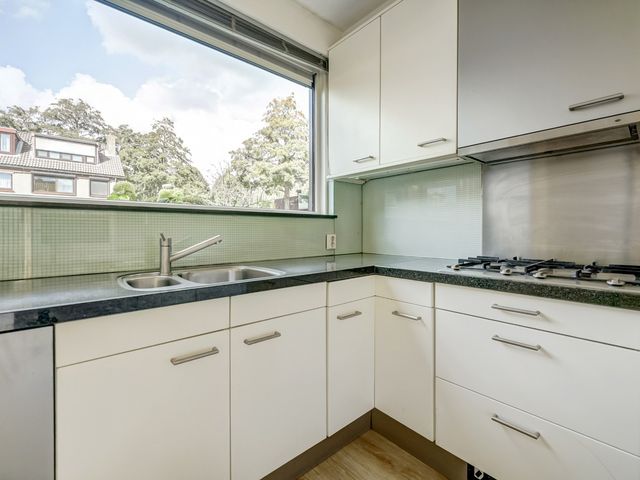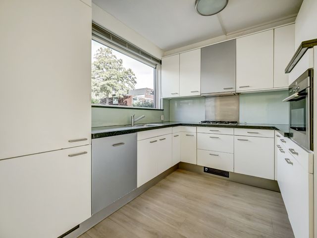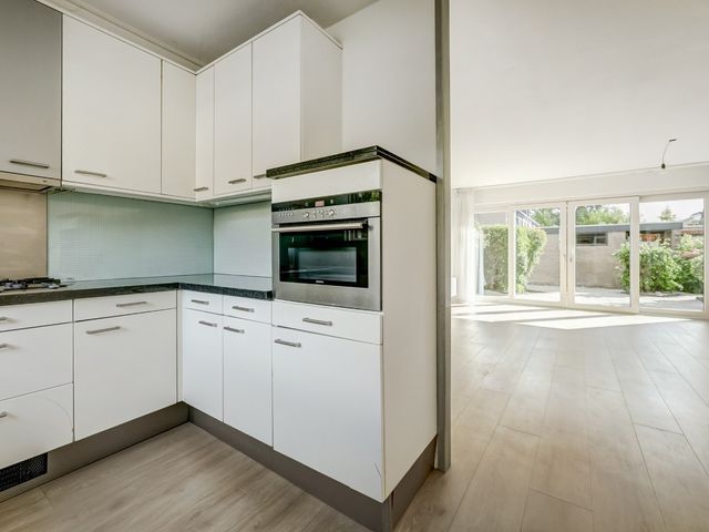 De aan de voorzijde gesitueerde keuken is geplaatst in een praktische U-opstelling en is voorzien van diverse inbouwapparatuur, waaronder een kookplaat, afzuigkap, oven, vaatwasser en koel-/vriescombinatie. De keuken biedt voldoende werk- en bergruimte.