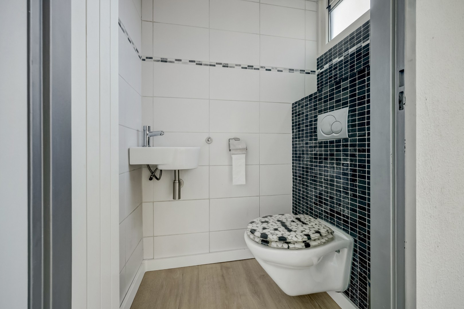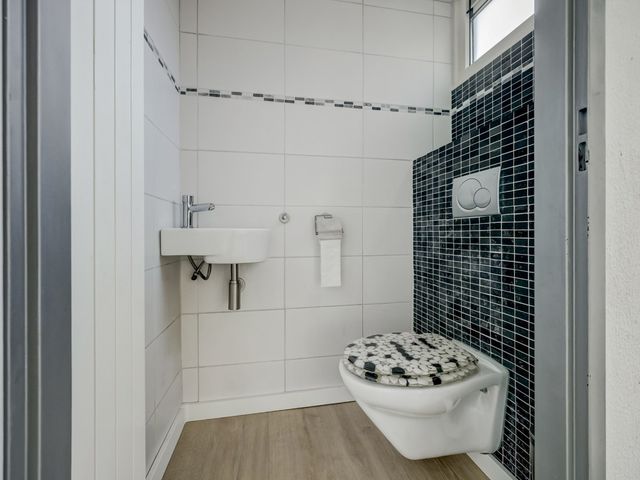 Bij binnenkomst via de verzorgde voortuin kom je in de entree/hal met meterkast en toegang tot het modern afgewerkte toilet voorzien van wandcloset en fonteintje.