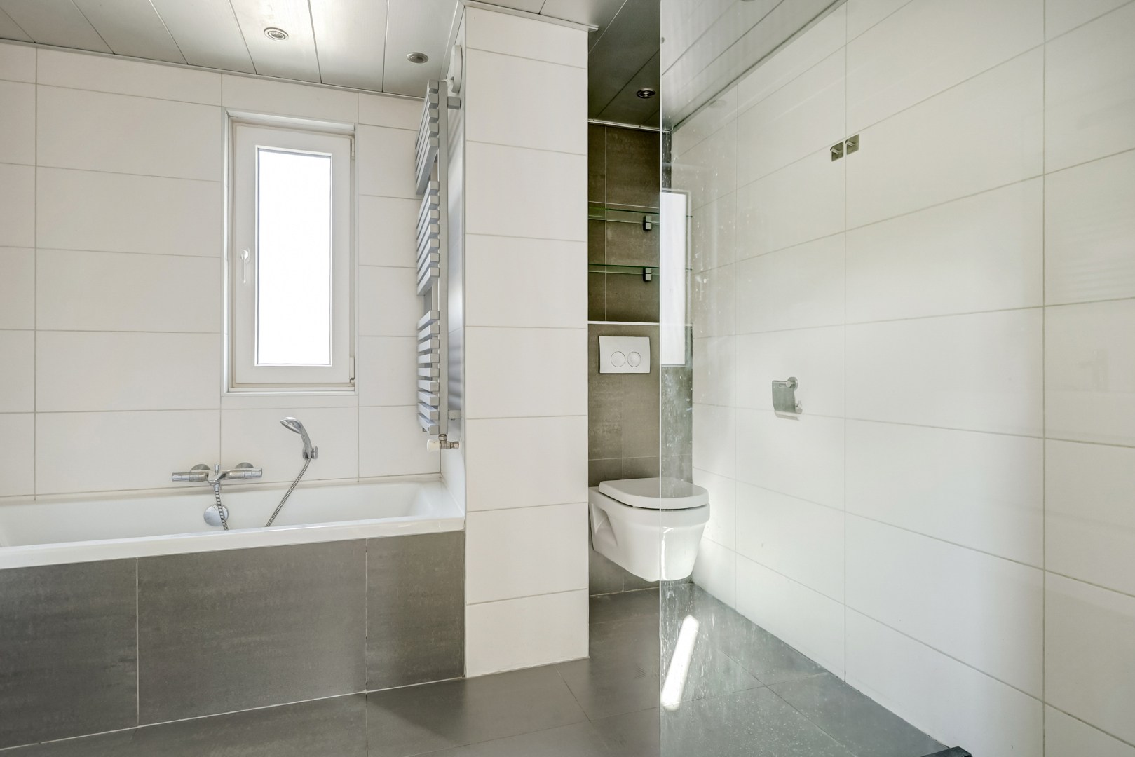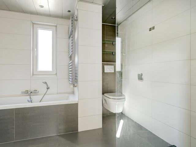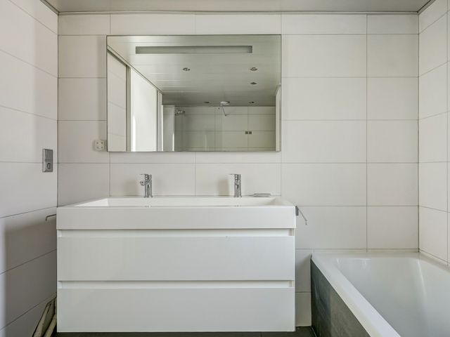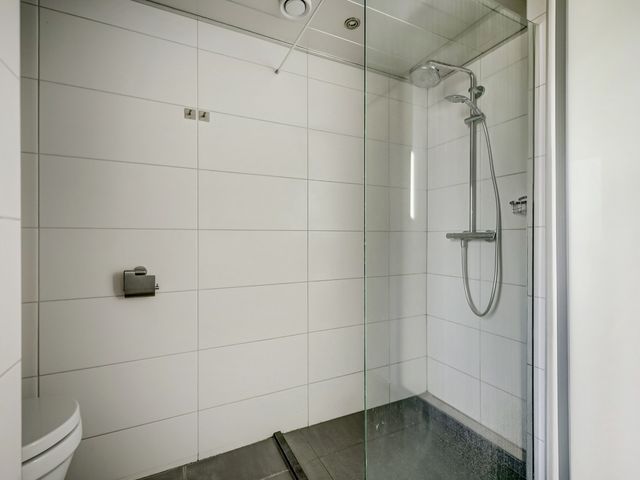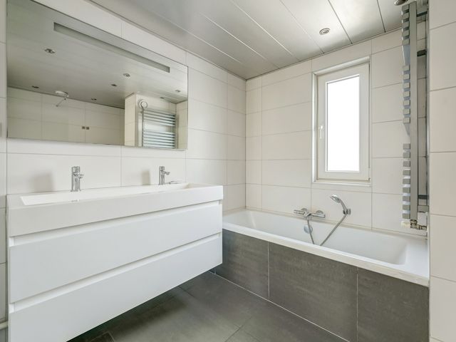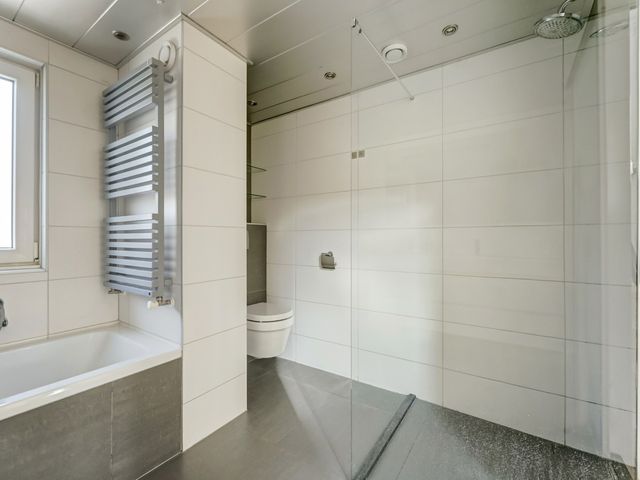De badkamer is smaakvol en ruim uitgevoerd, voorzien van een inloopdouche, een tweede wandcloset, een ligbad, een wastafelmeubel en zelfs een geïntegreerde radio-installatie.
