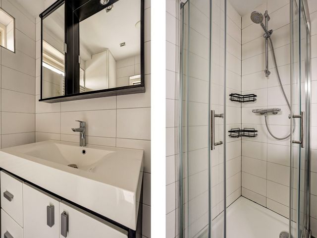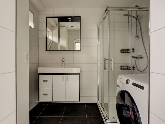 De volledig betegelde badkamer is verzorgd en compleet uitgevoerd met een inloopdouche, wastafelmeubel met spiegel, wasmachineaansluiting en een kast met de Cv-combiketel (2020).