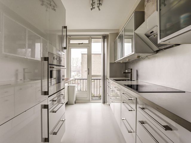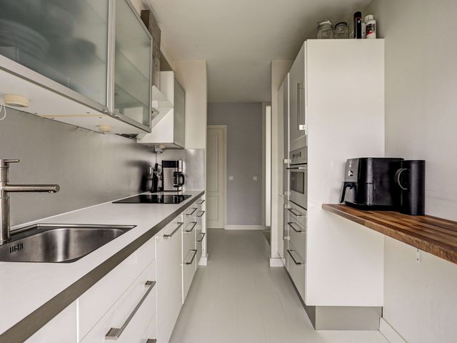 De keuken is praktisch ingericht met een rechte opstelling en een kastenwand aan de overzijde, voorzien van een koel-/vriescombinatie, combi-oven en veel bergruimte. Daarnaast beschikt de keuken over diverse inbouwapparatuur, waaronder een keramische kookplaat, afzuigkap en vaatwasser. Ook vanuit de keuken heeft u toegang tot het balkon aan de achterzijde.