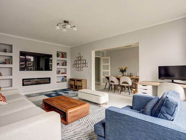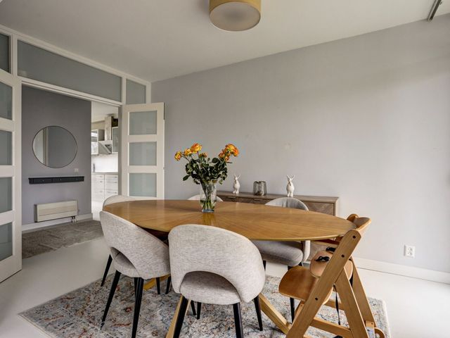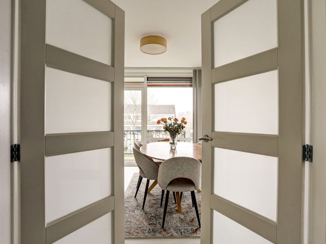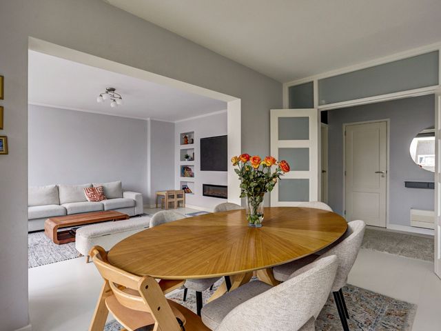 De woonkamer met eetkamer beschikken over grote raampartijen die zorgen voor een prachtig lichtinval en een ruimtelijk gevoel. De sfeervolle sierhaard vormt een mooi centraal element. Vanuit de eetkamer heeft u direct toegang tot het zonnige balkon op het zuidwesten, waar u dankzij de gunstige ligging en het aanwezige zonnescherm tot in de late uurtjes van de zon kunt genieten.