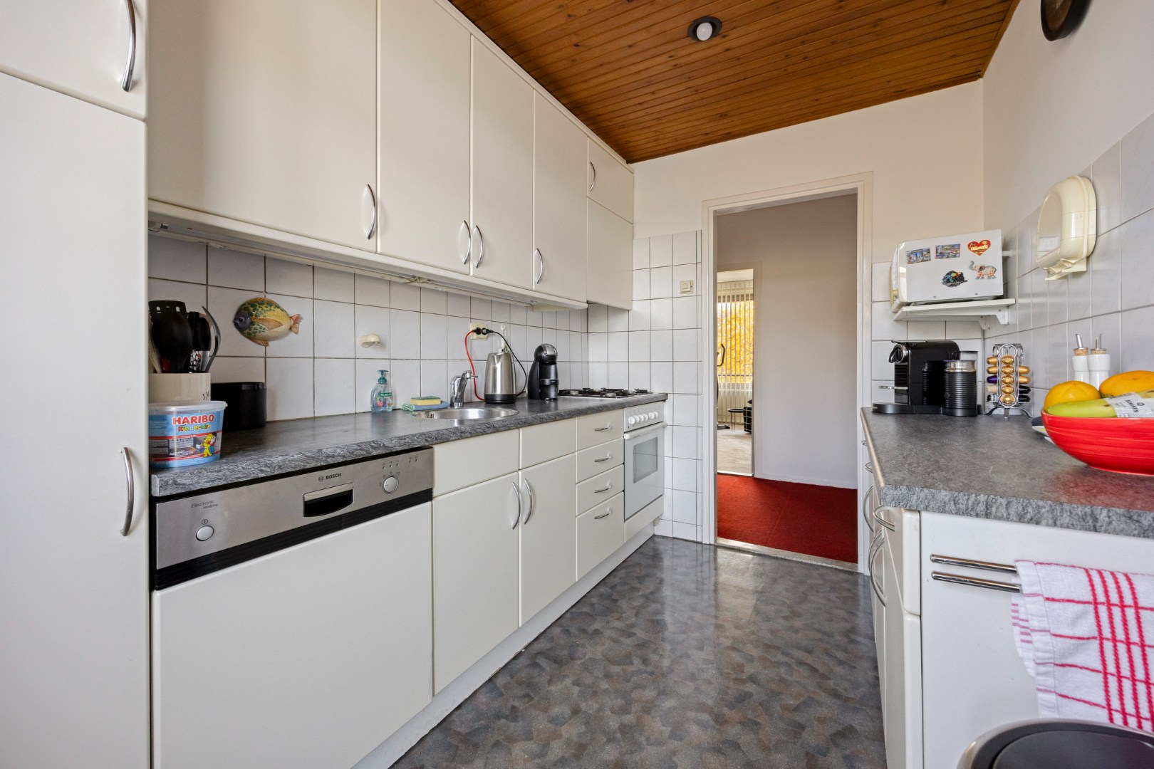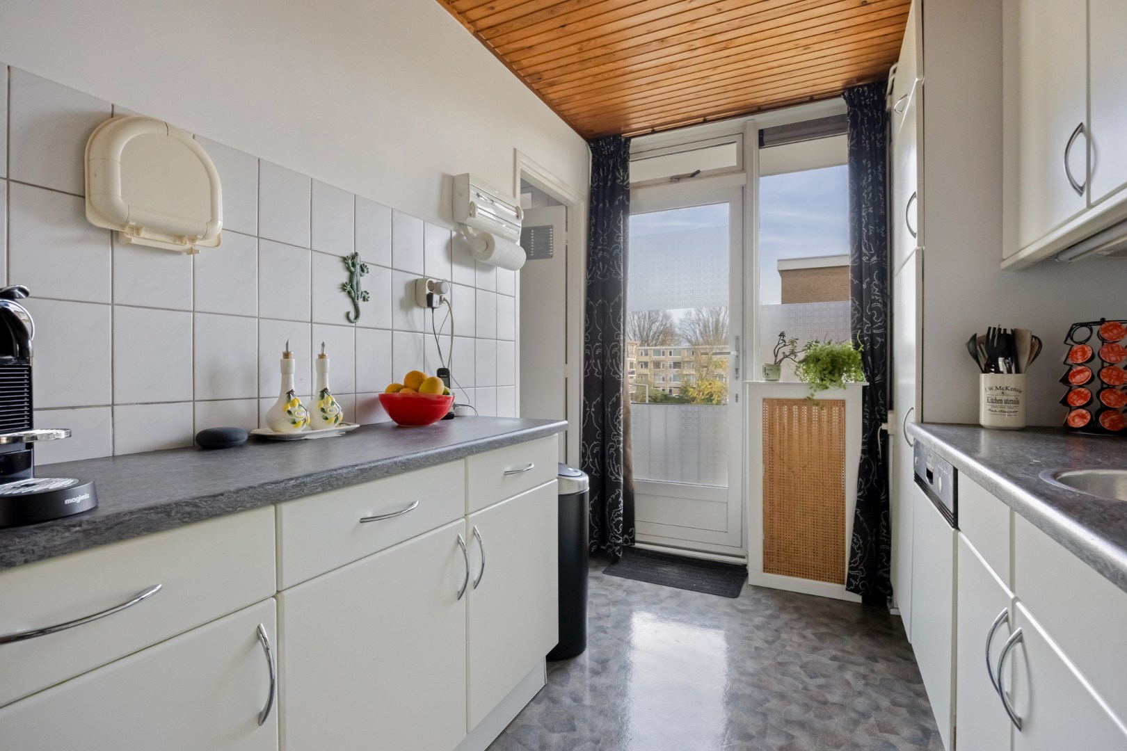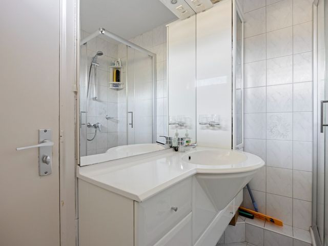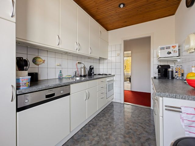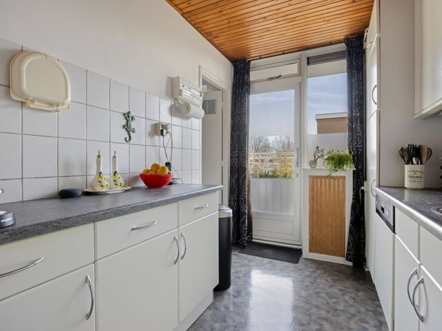 De keuken is praktisch ingericht met een keukenblok in dubbele rechte opstelling. Er is volop kastruimte en de keuken is voorzien van diverse inbouwapparatuur, waaronder een 4-pits gaskookplaat, afzuigkap, koel-/vriescombinatie, oven en vaatwasser. Vanuit de keuken stapt u direct het balkon op aan de noordoostzijde, een heerlijke plek voor een kop koffie in de ochtendzon.