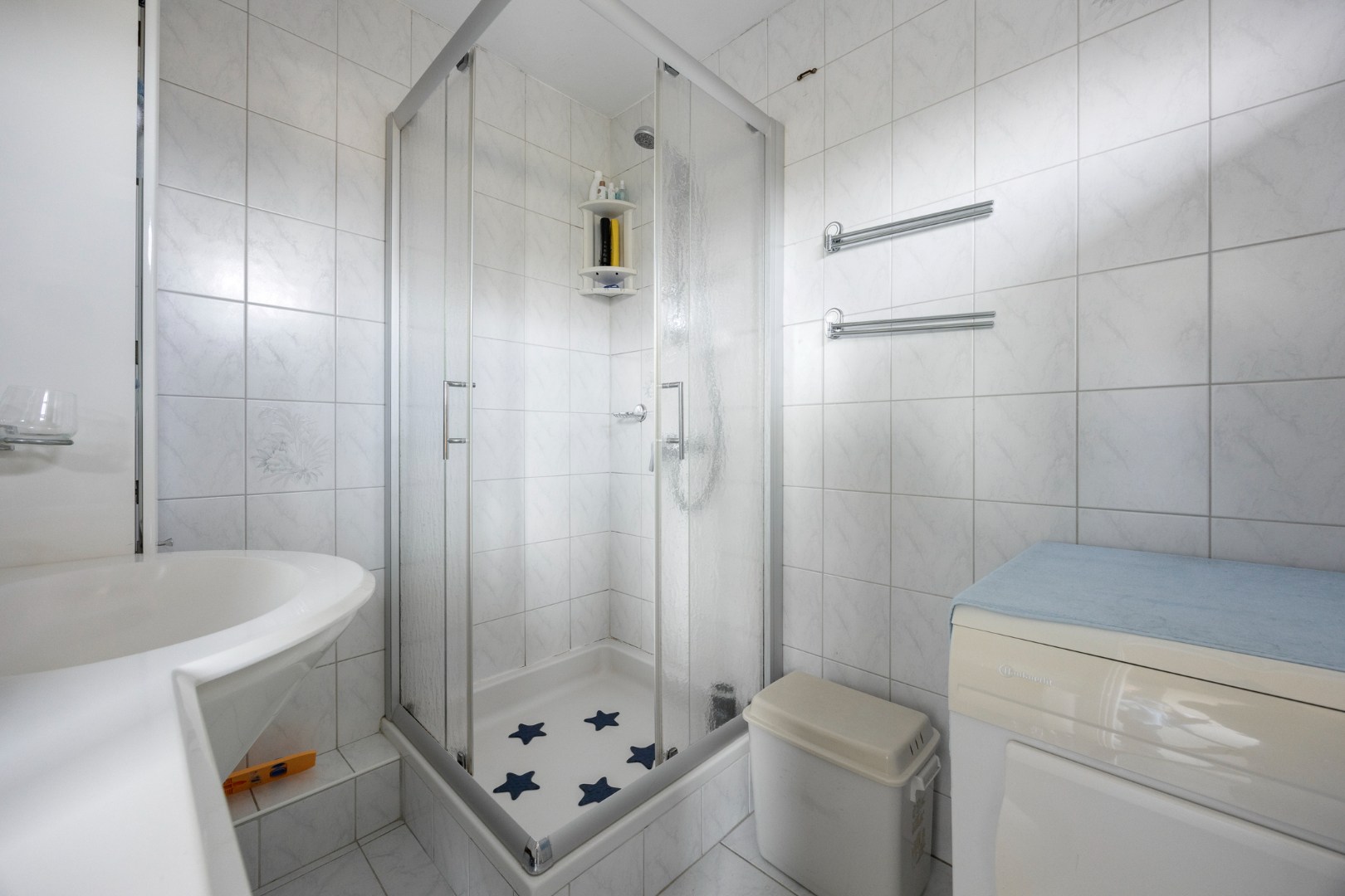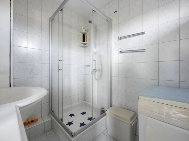 Verder beschikt de woning over twee goed bemeten slaapkamers van respectievelijk ca. 3.55 x 4.00 m en 4.02 x 2.74 m. De nette badkamer is volledig betegeld en uitgerust met een wastafel in meubel, een douchecabine met handdouche en een opstelplaats voor de wasmachine.