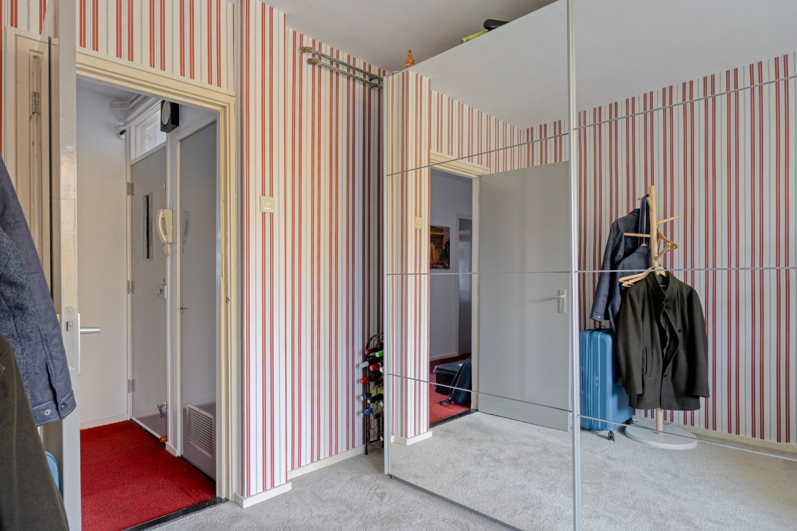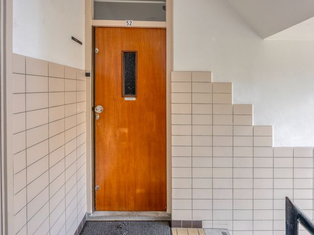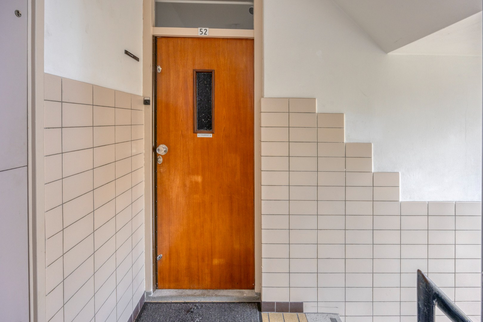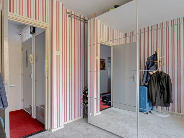 Afgesloten portiek met brievenbussen en een bellentableau. Toegang tot het trappenhuis en de ruime bergingen.