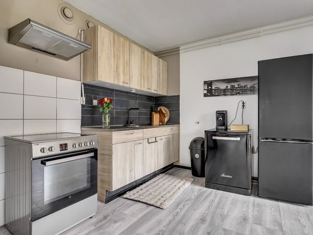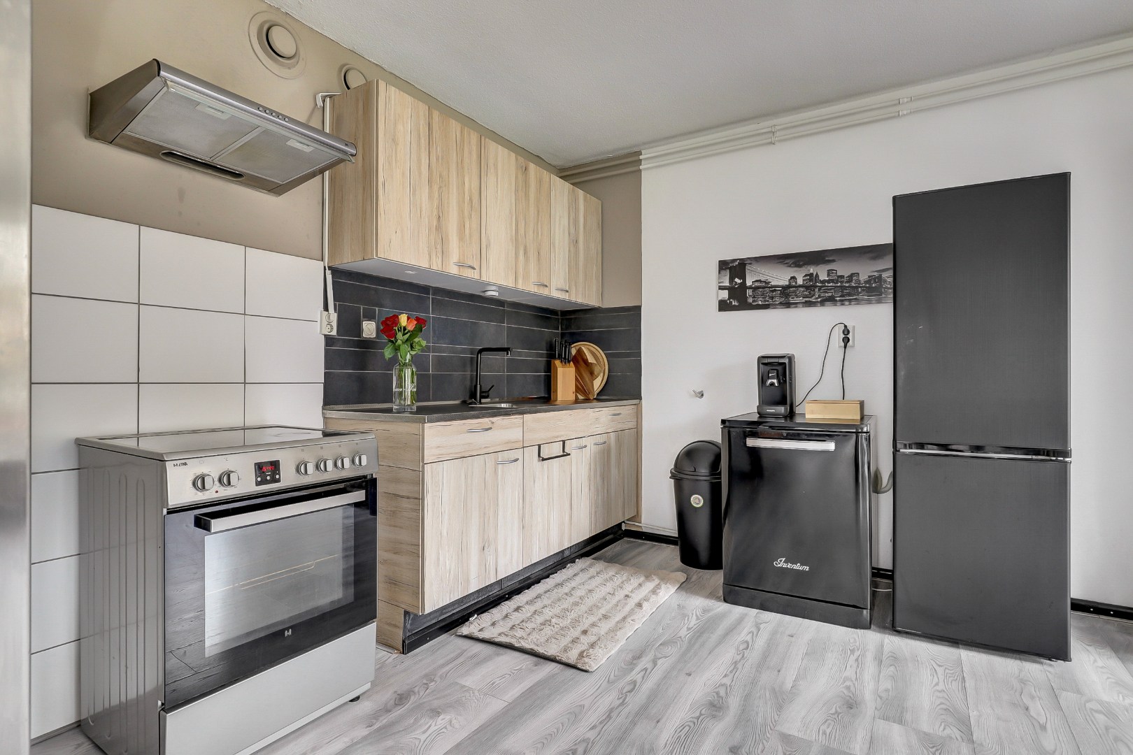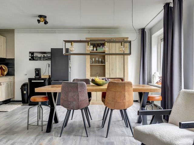 De open keuken heeft een stijlvolle houten look en is voorzien van een inductiekookplaat, afzuigkap, oven, koelkast, vriezer én vaatwasser, koken was nog nooit zo fijn!