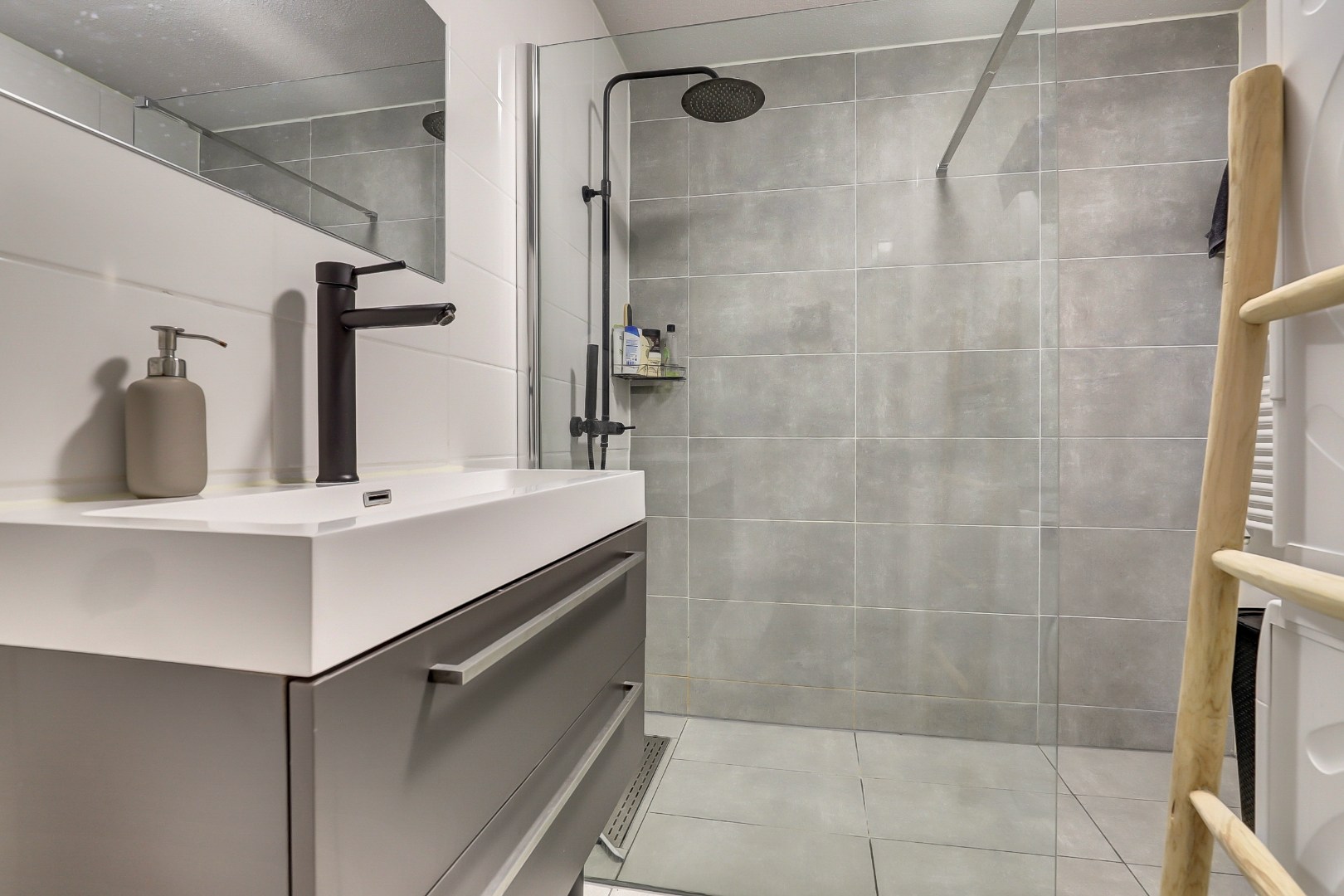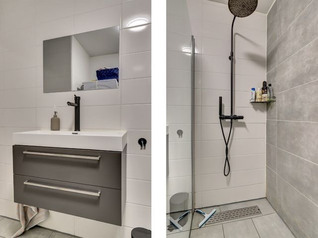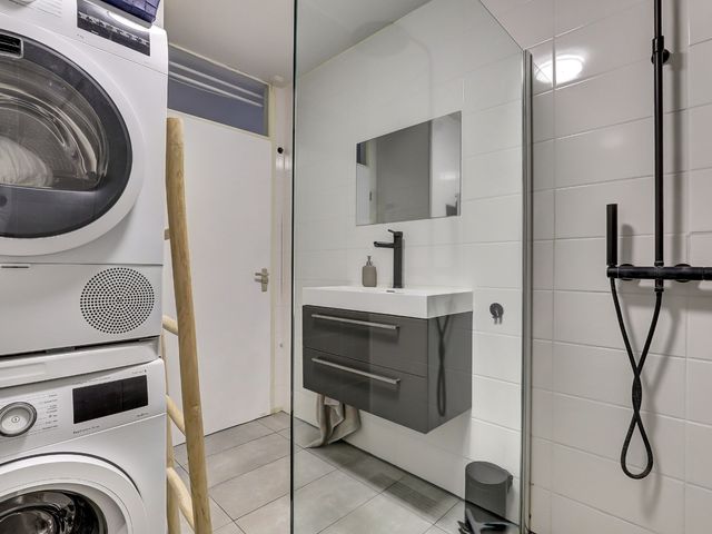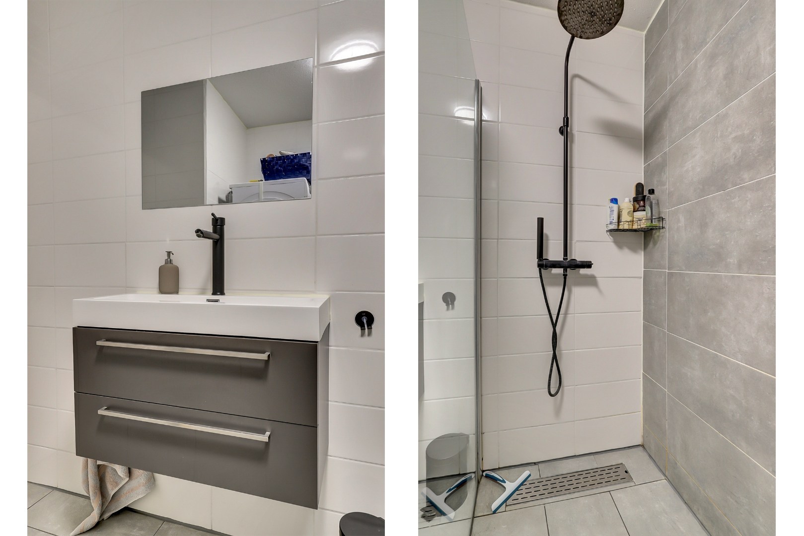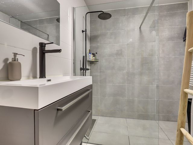 De moderne badkamer is een echte blikvanger, volledig betegeld, met een breed wastafelmeubel, inloopdouche met regendouche en ruimte voor de wasmachine en droger. Hier begint u elke dag fris en ontspannen.