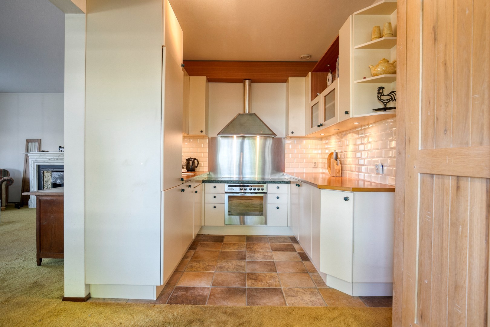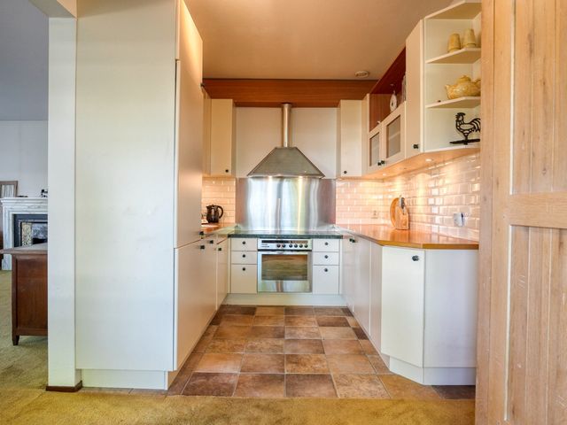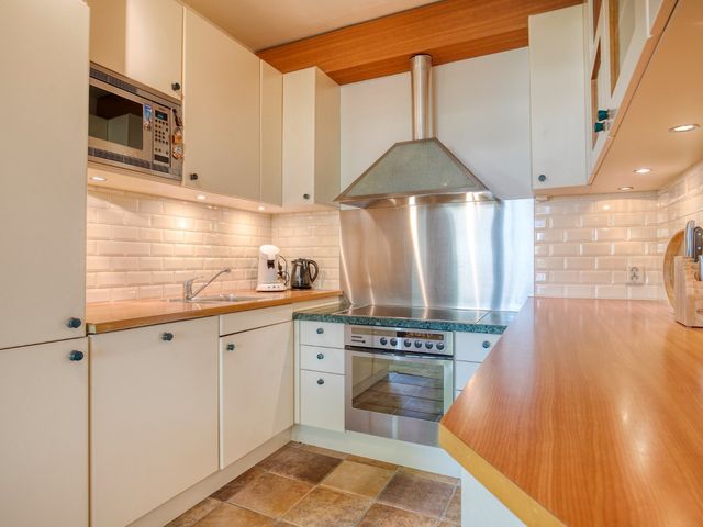 De halfopen keuken in U-opstelling is compleet uitgerust met een inductiekookplaat, afzuigkap, koel-/vriescombinatie, oven, magnetron en vaatwasser.