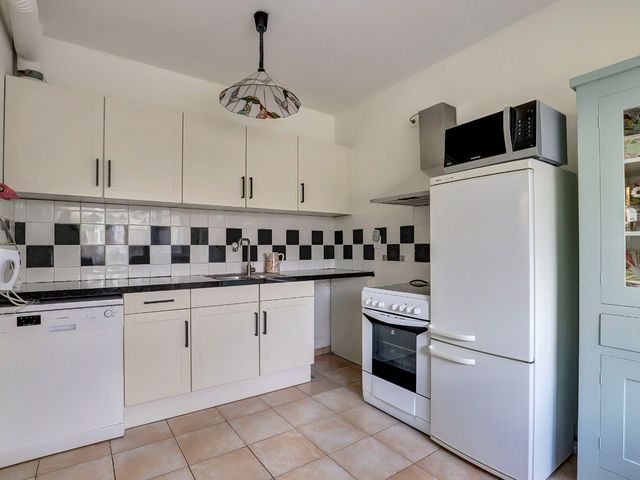 De ruime keuken is uitgevoerd in een rechte opstelling en voorzien van diverse apparatuur, waaronder een afzuigkap, keramische kookplaat, oven en een koel-/vriescombinatie.