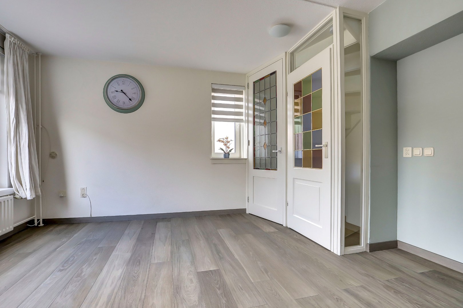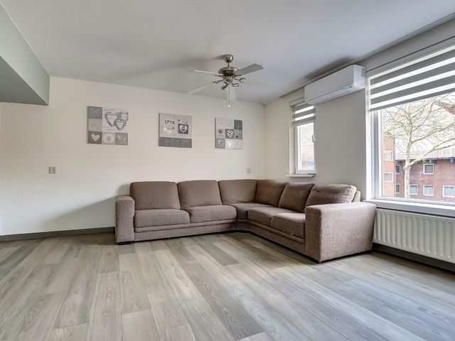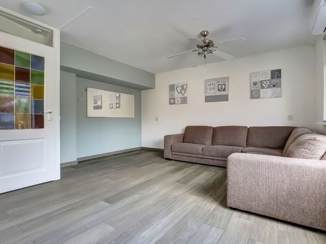 Hier bevindt zich de verrassend lichte woonkamer met een fraaie vloer,- muur,- en plafond afwerking. Dankzij de hoekligging en de vele raampartijen geniet u hier van veel lichtinval en een vrij uitzicht. Tevens beschikt de woonkamer over airconditioning, wat zorgt voor extra comfort in alle seizoenen.