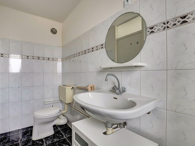 De tweede verdieping biedt ruimte aan een royale slaapkamer en de badkamer. De slaapkamer beschikt over airconditioning en een praktische vaste kast en geeft direct toegang tot de badkamer. Deze is uitgerust met een bad met handdouche, wastafel en een tweede toilet.