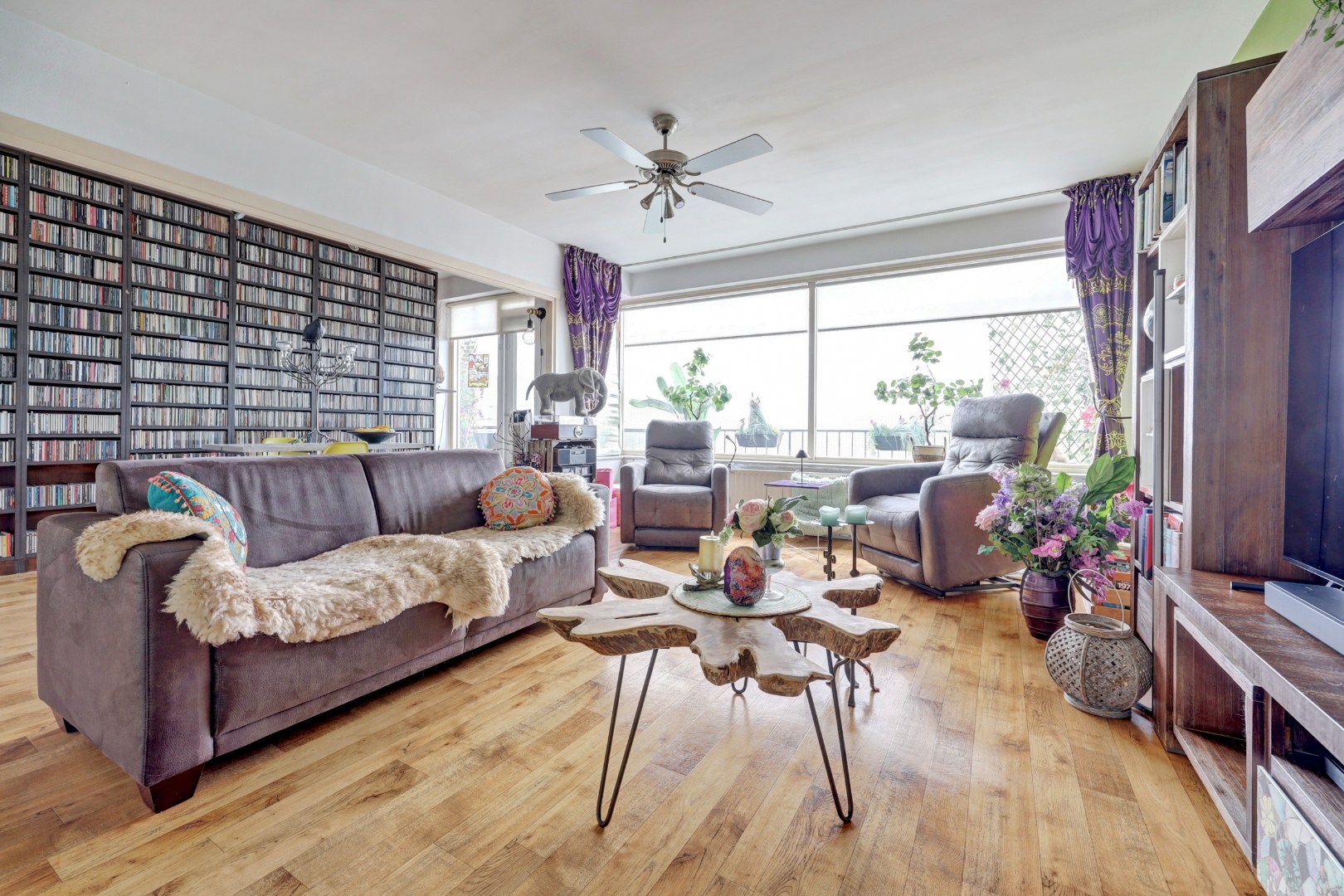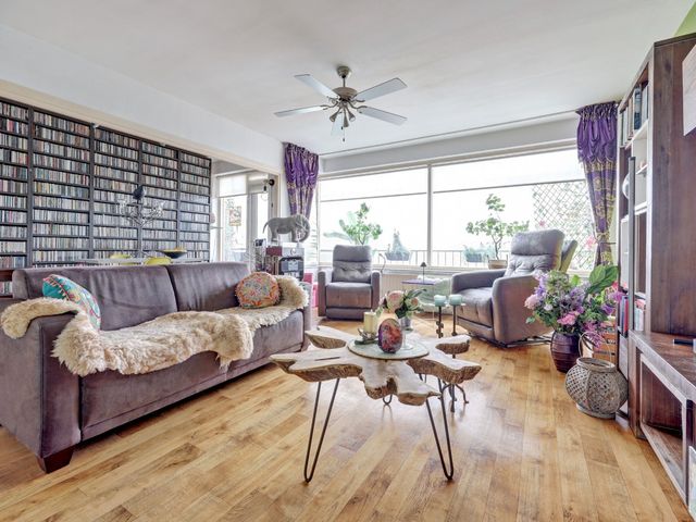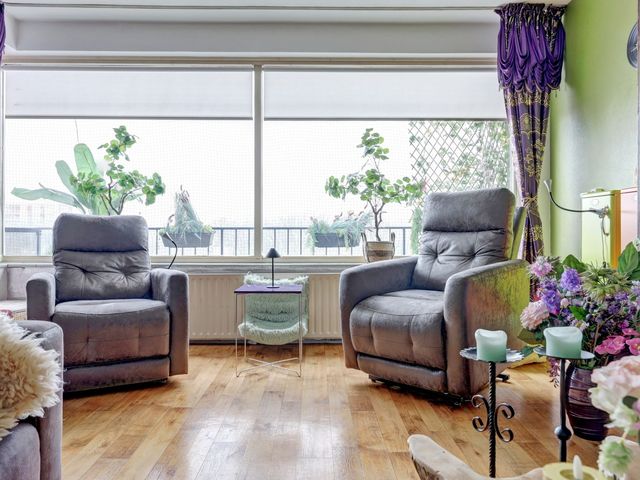 De woonkamer is vergroot door samentrekken met een slaapkamer, dankzij de grote raampartijen geniet u hier van volop licht. Vanuit de woonkamer heeft u toegang tot het zonnige balkon.
