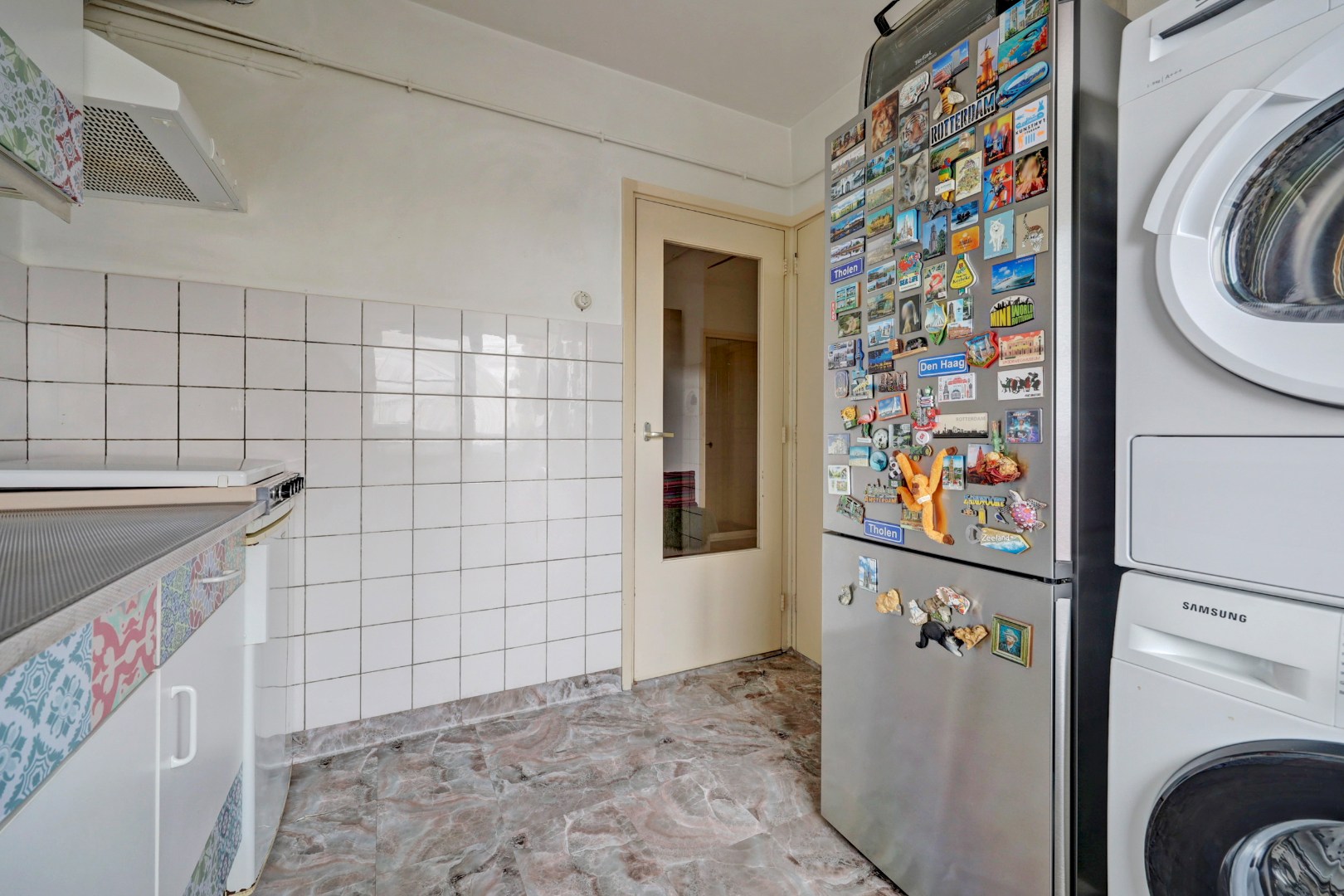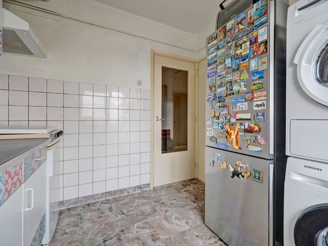 De keuken is eenvoudig in een rechte opstelling met aansluiting voor de wasmachine en/of droger en voorzien van een vaste kast.