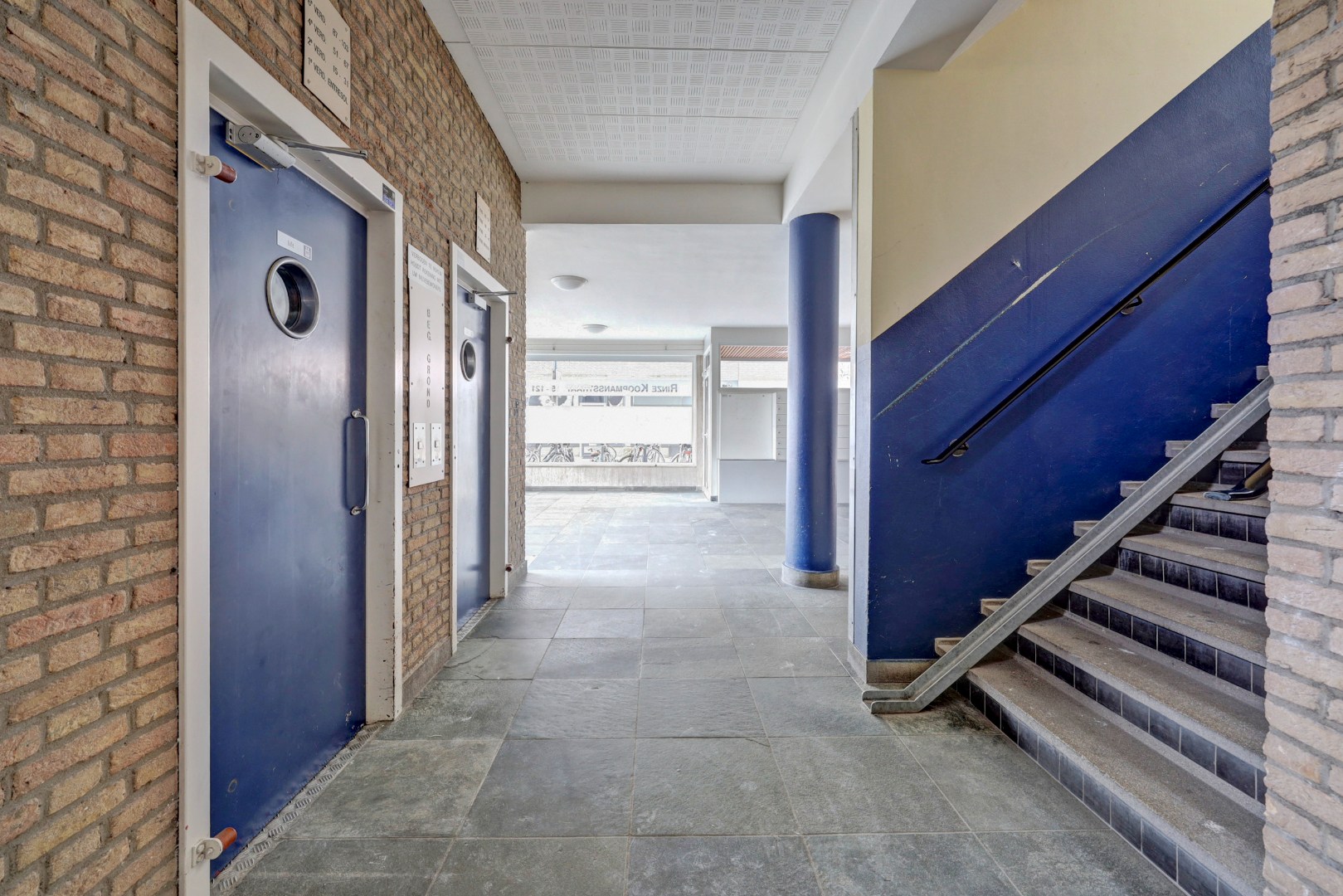 Entree, brievenbussen, toegang tot de liftinstallaties, trappenhuis en bergingen op de eerste verdieping.