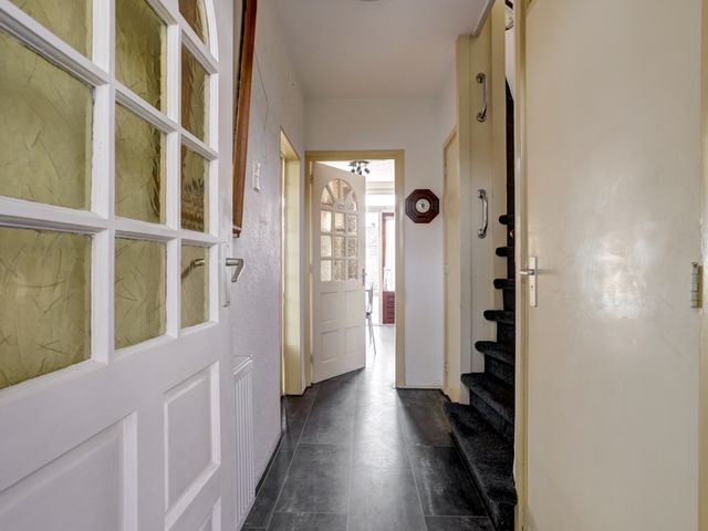 Via de op het zuid- westen gelegen voortuin bereikt u de entree van de woning. In de hal vindt u de meterkast, een vaste kast en een deels betegelde toiletruimte met duoblok en fonteintje. Vanuit de hal heeft u toegang tot de woonkamer, de keuken en de trapopgang naar de eerste verdieping.