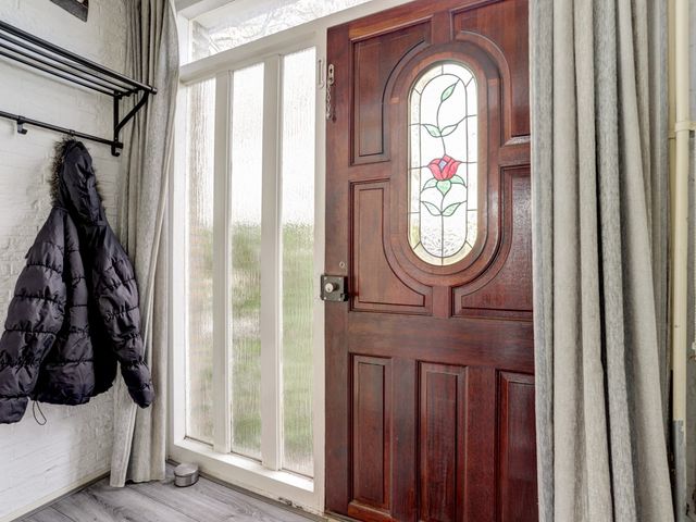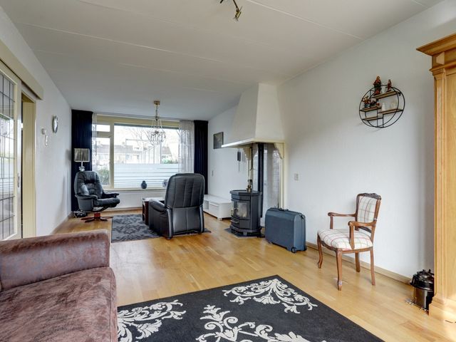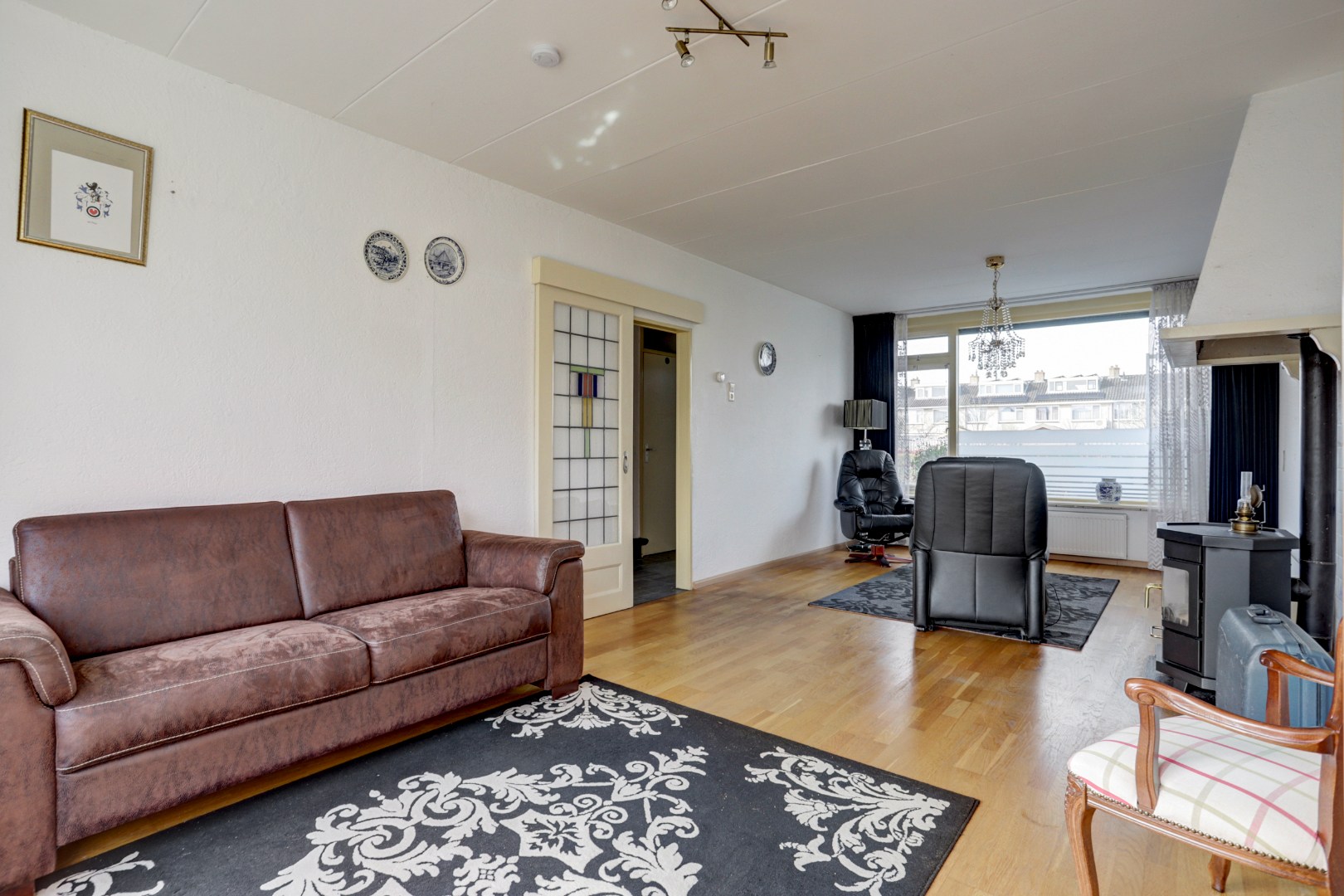 De doorzonwoonkamer is bereikbaar via een schuifdeur met glas-in-looddetails en beschikt over een houtkachel, die zorgt voor een warme en authentieke uitstraling.