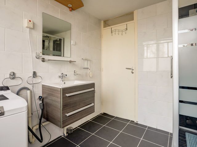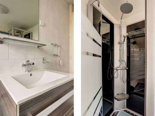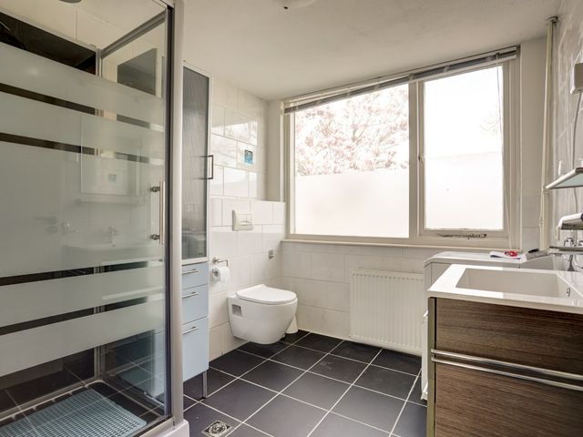 De ruime, volledig betegelde badkamer is uitgerust met een douchecabine met regen- en handdouche, een wastafelmeubel met spiegel, een handdoekenkast, aansluiting voor de wasmachine en een tweede toilet.
