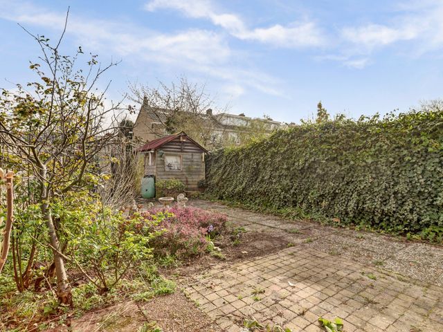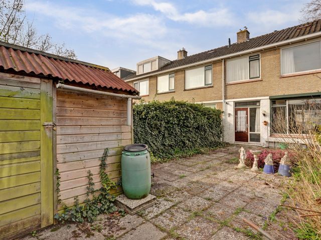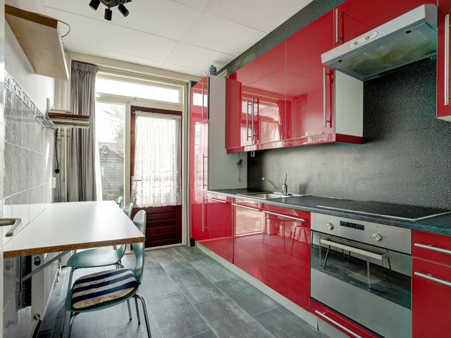 De kleurrijke keuken is uitgevoerd in een rechte opstelling en voorzien van diverse inbouwapparatuur, waaronder een afzuigkap, inductiekookplaat, koel-/vriescombinatie, oven en vaatwasser. Vanuit de keuken heeft u direct toegang tot de achtertuin, gelegen op het oosten. De tuin beschikt over een houten berging en een praktische achterom.