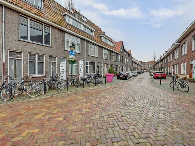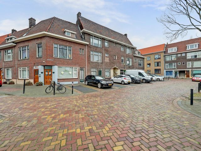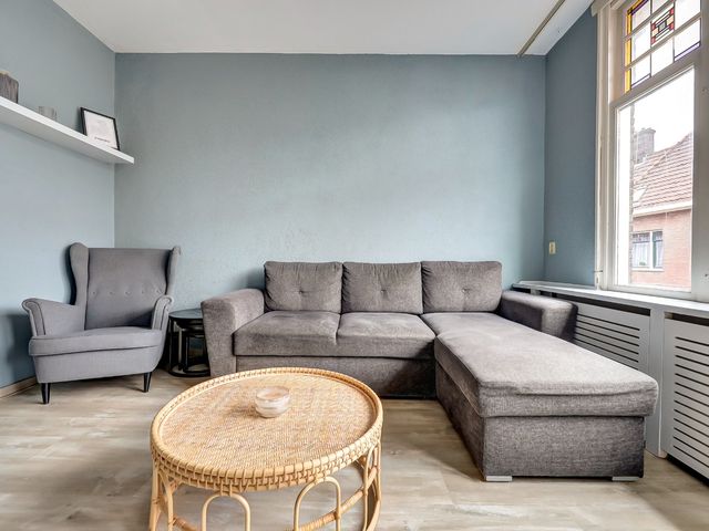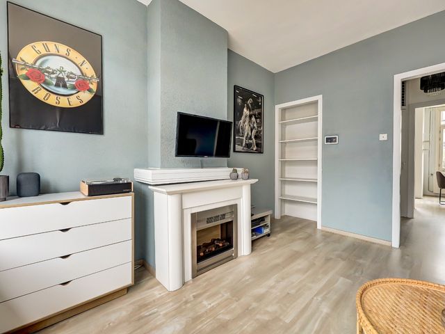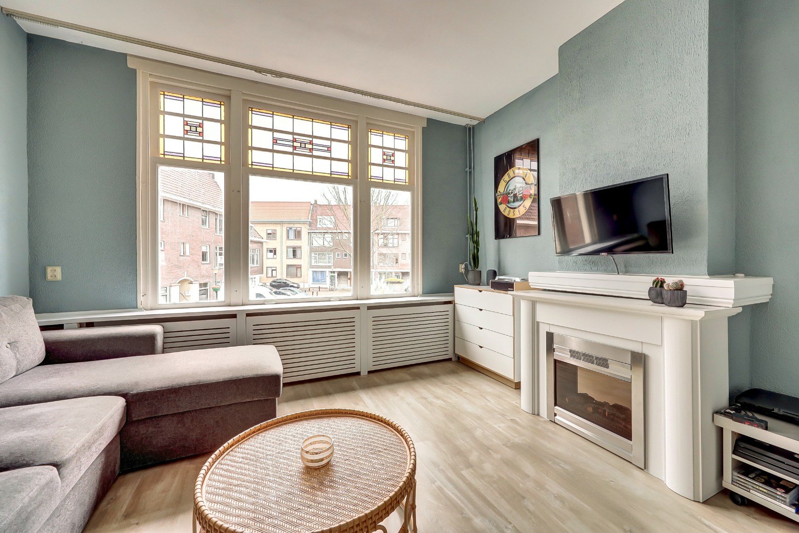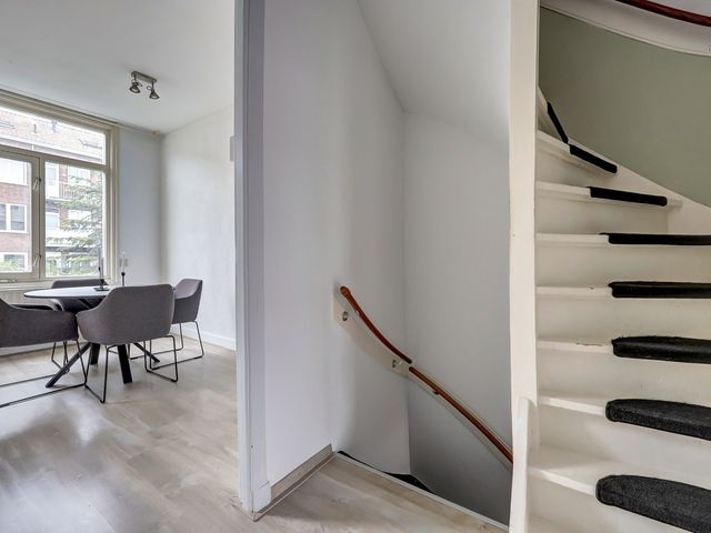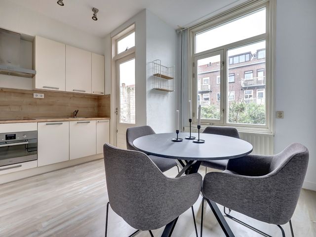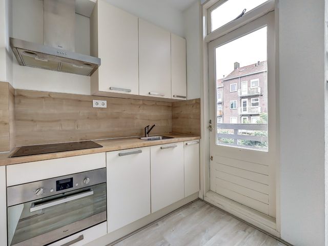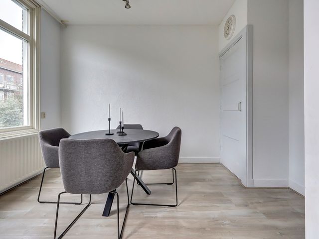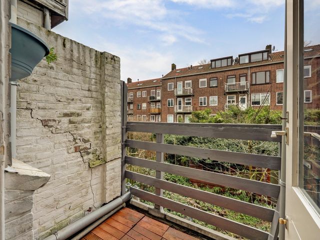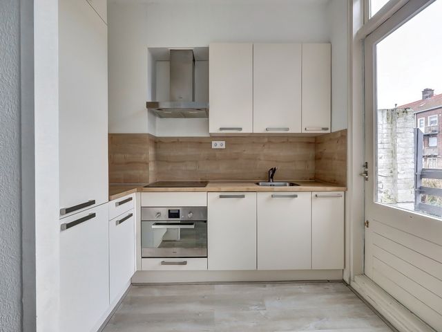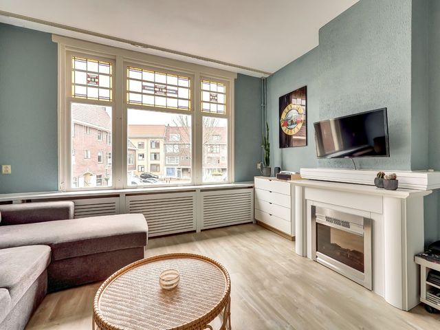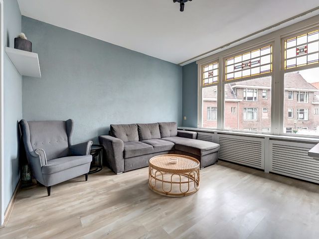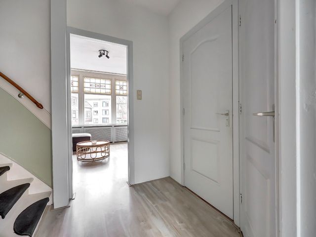 Deze bovenwoning beschikt over een lichte woonkamer met karakteristieke glas-in-looddetails. De ruime L-vormige keuken is van inbouwapparatuur voorzien, biedt plek voor een gezellige eettafel en geeft toegang tot het balkon.