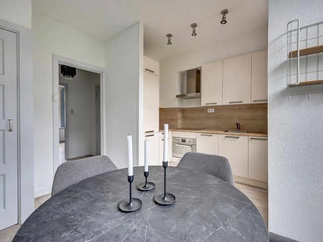 De keuken is uitgevoerd in een L-opstelling en voorzien van diverse inbouwapparatuur, waaronder een afzuigkap, koel-vriescombinatie, kookplaat, vaatwasser en combi oven/magnetron. Dankzij de royale ruimte is er volop plek voor een eethoek. Tevens beschikt de keuken ook over een vaste kast voor extra bergruimte. Vanuit de keuken stapt u zo het balkon op.