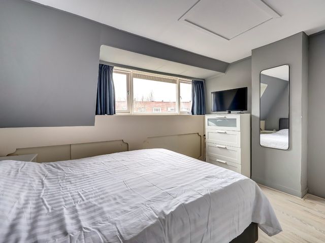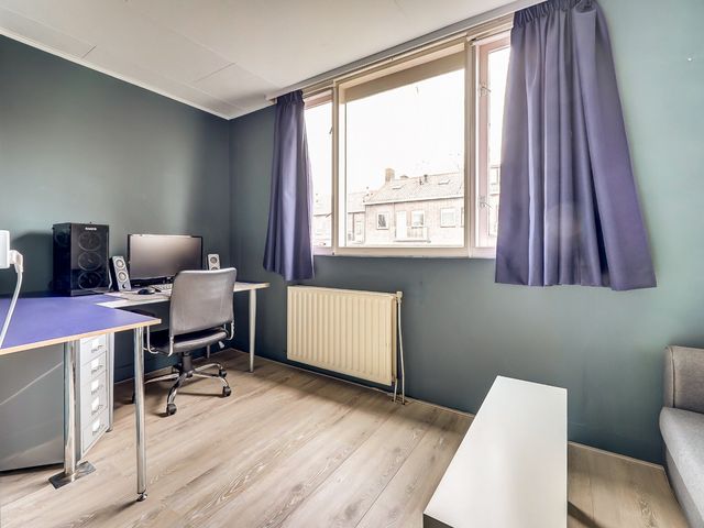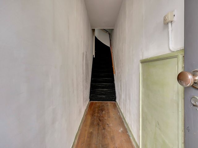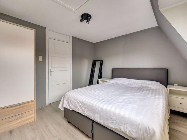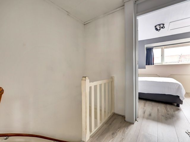 Overloop met toegang tot de vertrekken. De woning beschikt over twee slaapkamers, gelegen aan zowel de voor- als achterzijde van de woning. Beide kamers hebben prettig licht. De slaapkamer aan de voorzijde heeft bovendien een dakkapel, wat zorgt voor extra ruimte en een mooie lichtinval.