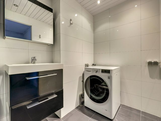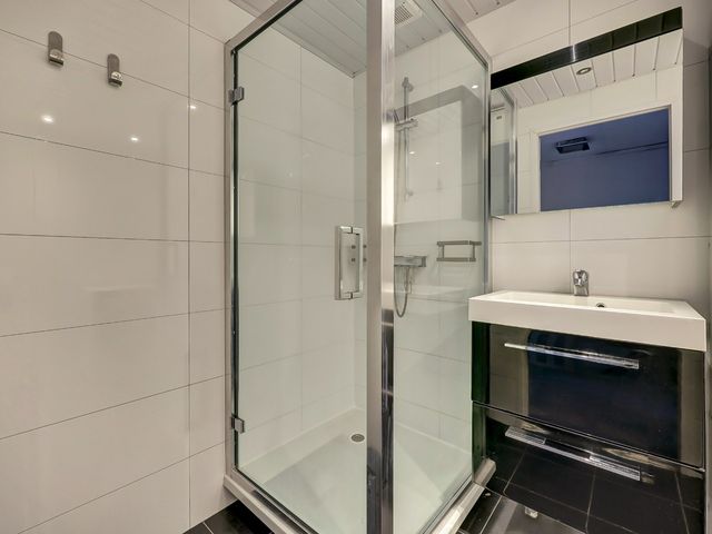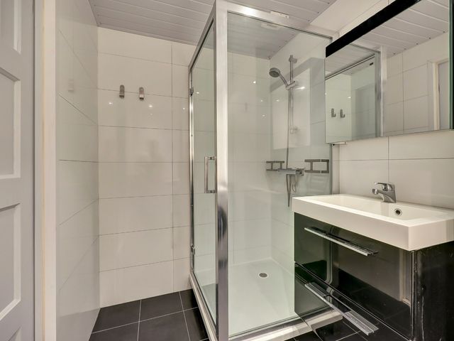 De ruime badkamer is volledig betegeld en van alle gemakken voorzien. U vindt hier een douchecabine met handdouche, een wastafelmeubel met bijpassend kastje en spiegel, inbouwspots én de opstelplaats voor de wasmachine.