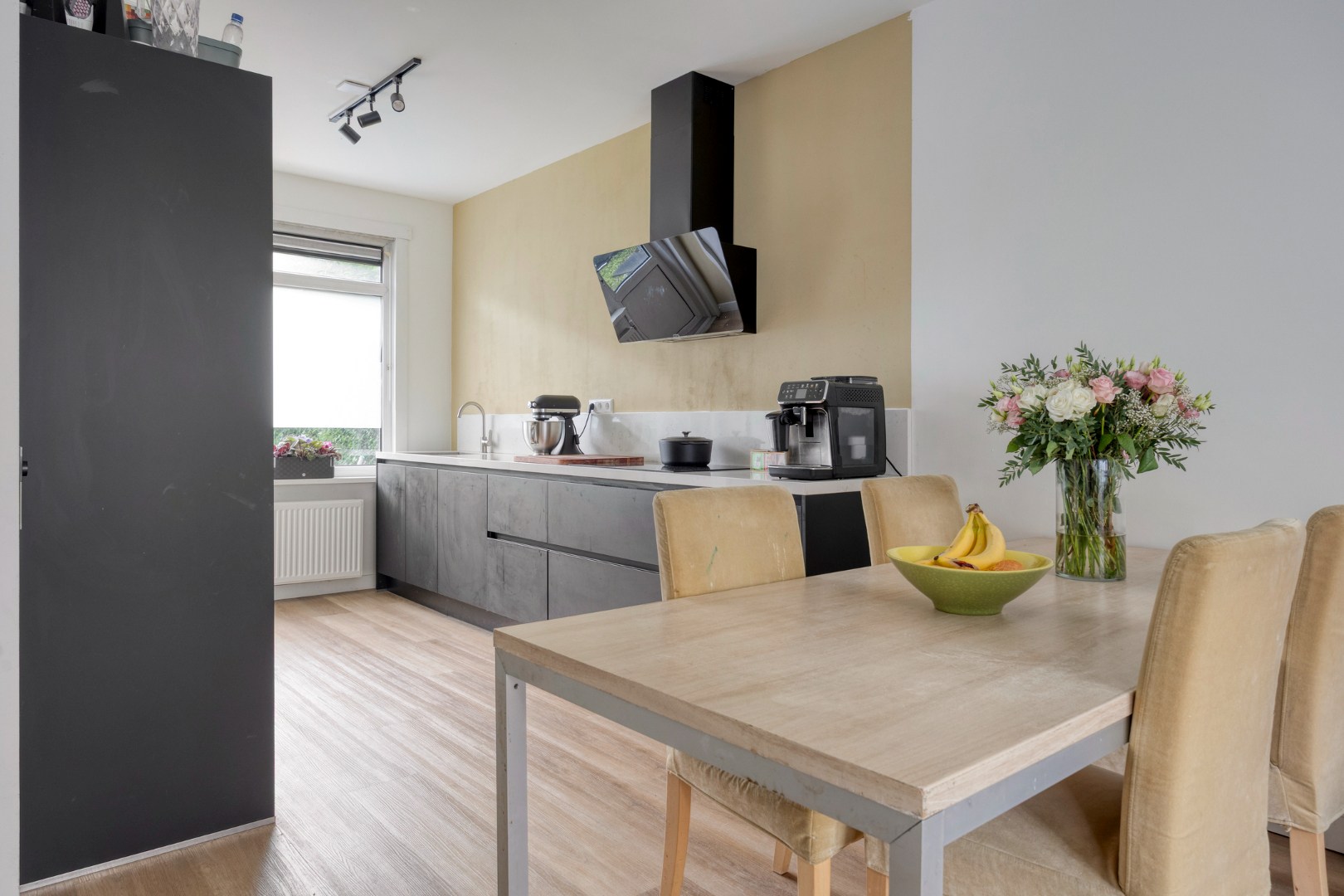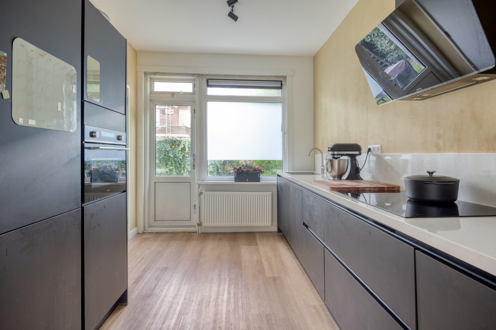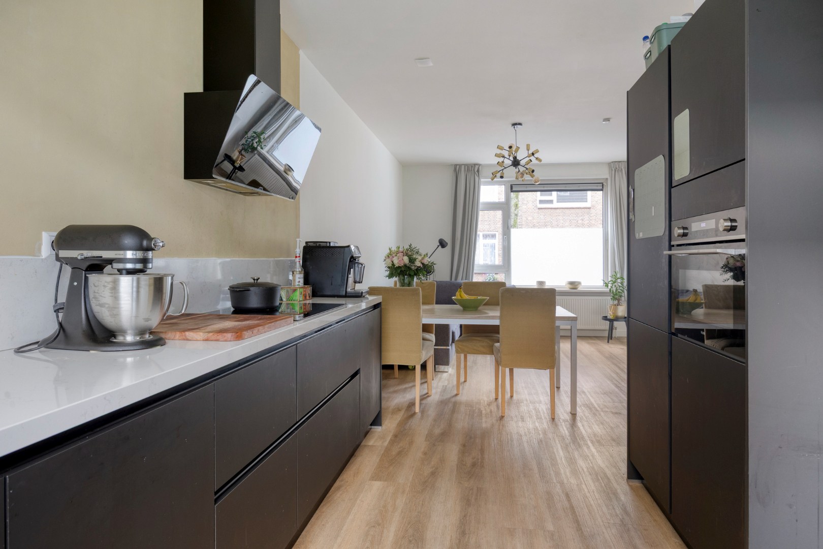De in 2024 geplaatste keuken in dubbele rechte opstelling is voorzien van hoogwaardige inbouwapparatuur, waaronder een afzuigkap, inductiekookplaat, koel-/vriescombinatie, combi-oven/magnetron en vaatwasser.