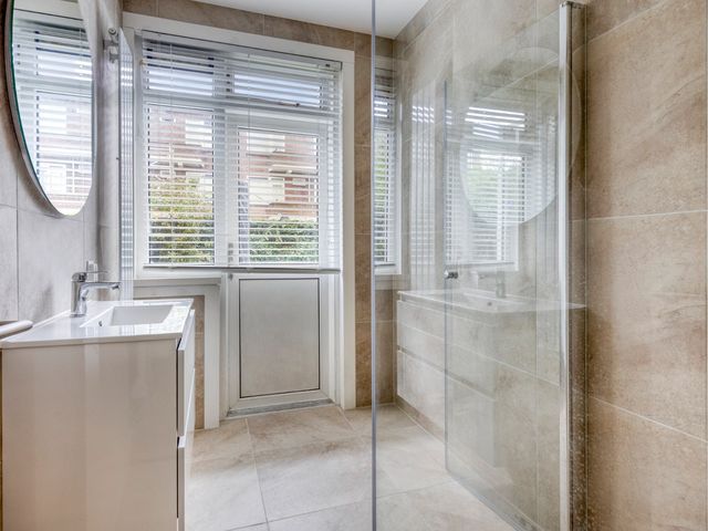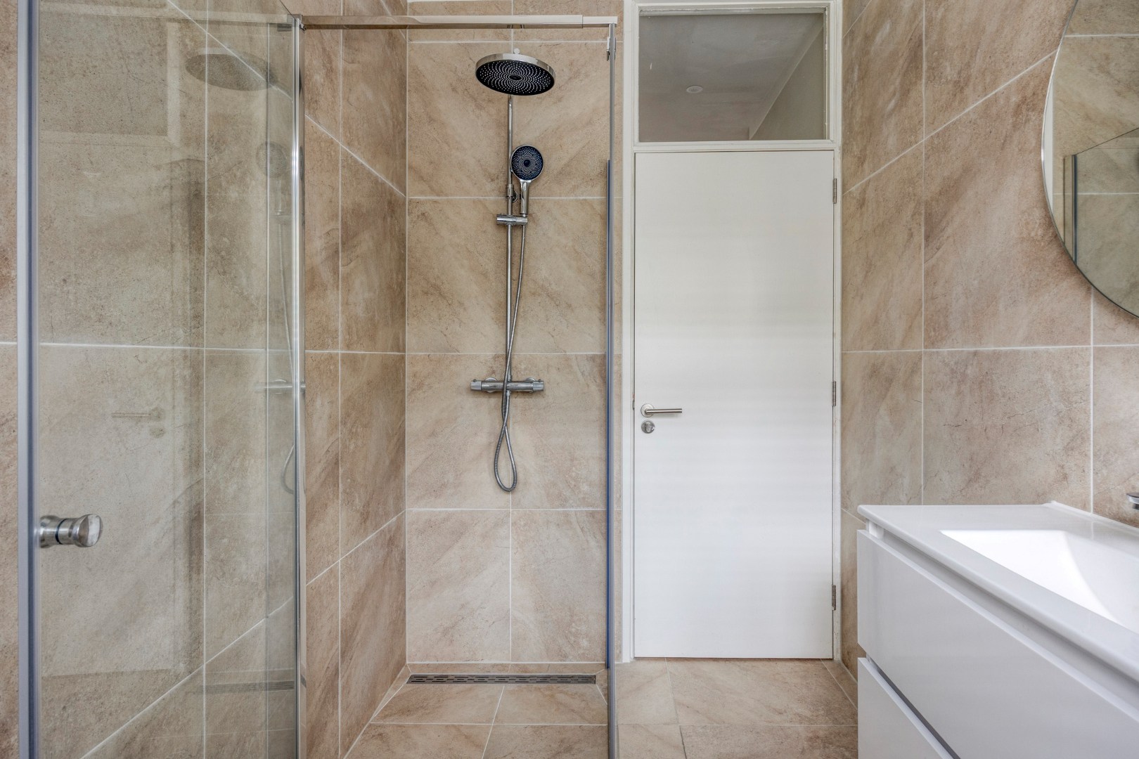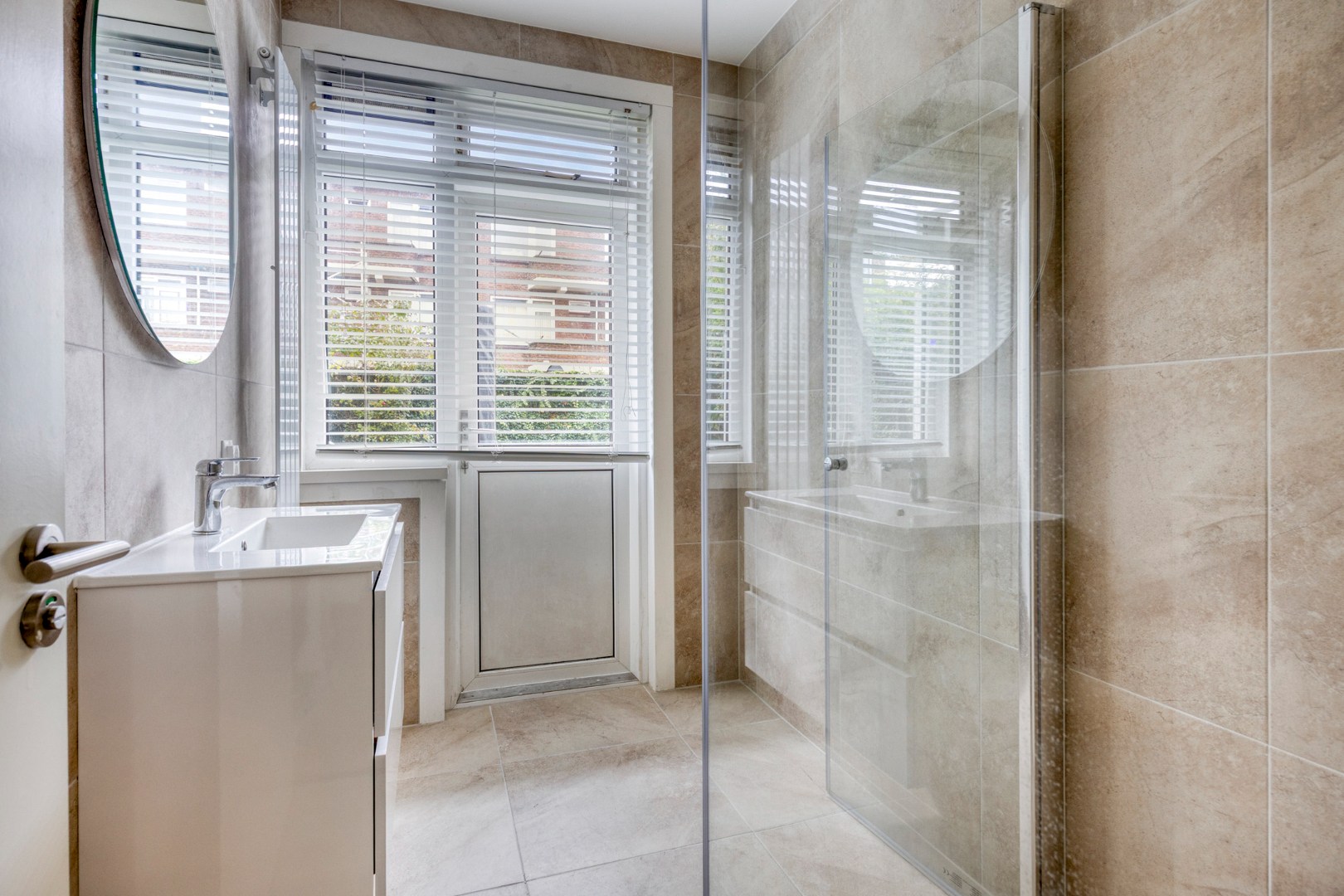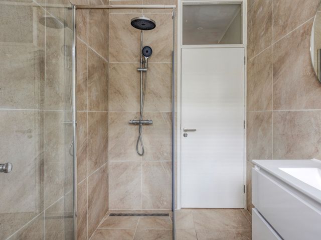 De woning beschikt over een ruime en moderne badkamer (2025) met een inloopdouche met regen- en handdouche, een wastafelmeubel met ronde spiegel en zelfs toegang tot de tuin.