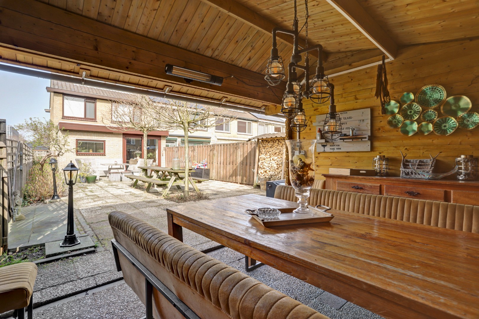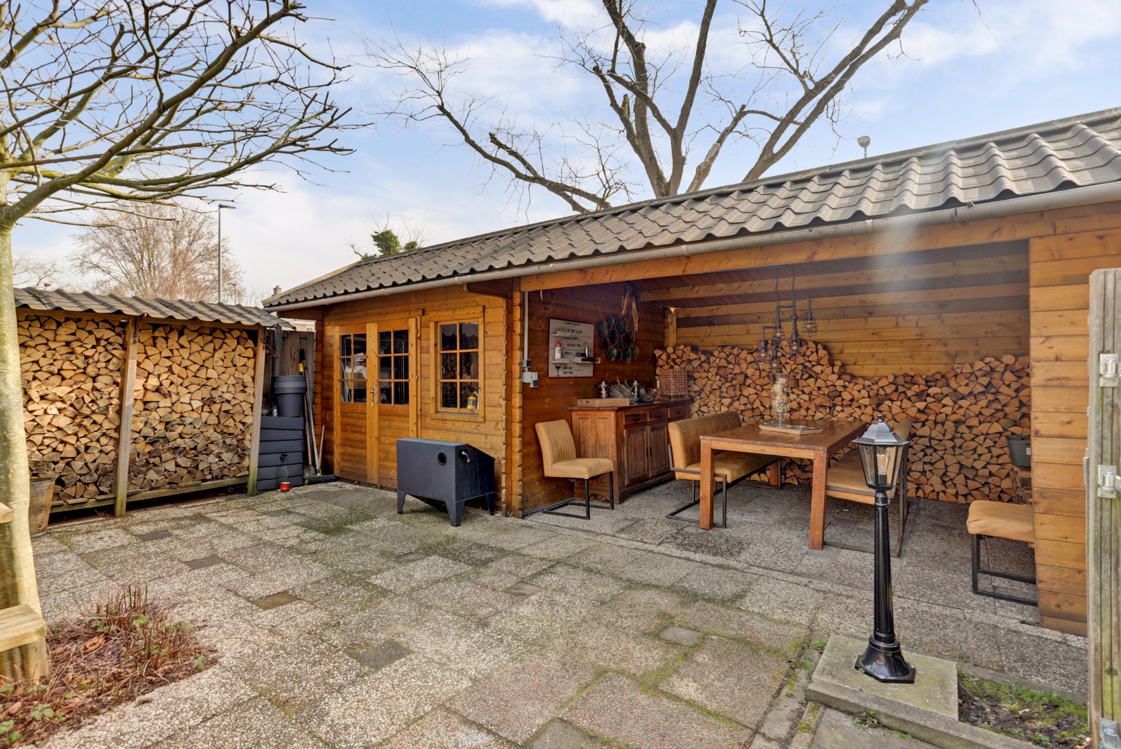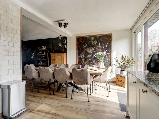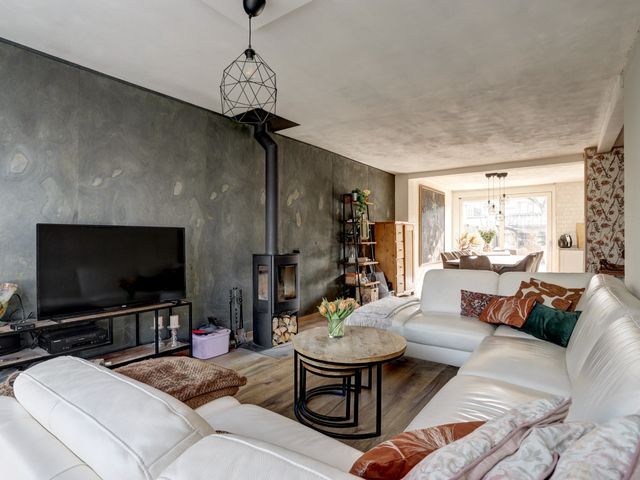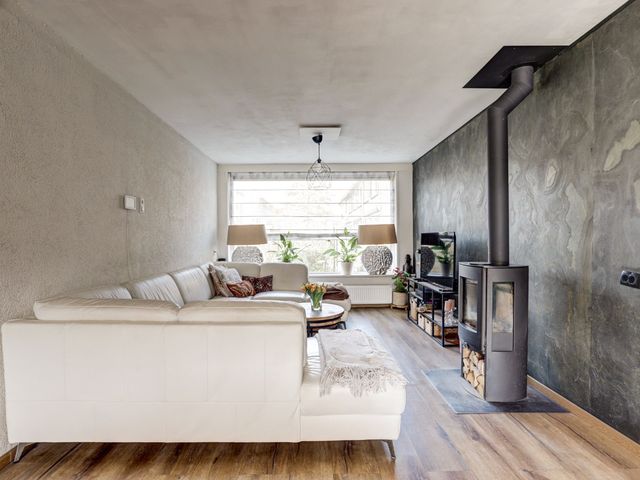 De ruime living is voorzien van een houtkachel die niet alleen zorgt voor extra warmte maar ook voor gezelligheid.