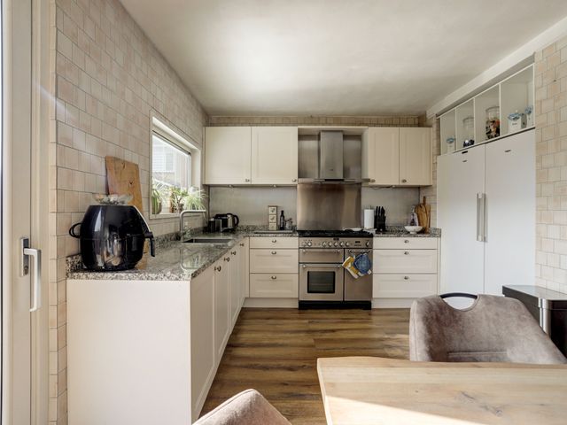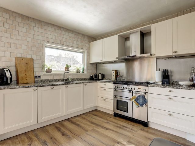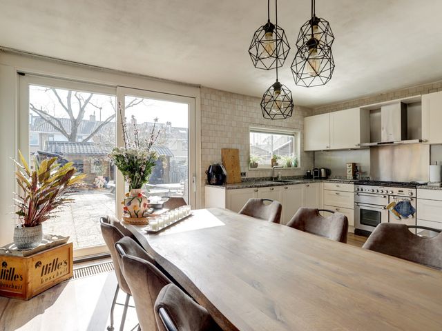 Aan de achterzijde van de woning bevindt zich de woonkeuken met convectorput en kunststof schuifpui naar de achtertuin. De keuken beschikt over diverse inbouwapparatuur, waaronder een afzuigkap, gaskookplaat, koelkast, vriezer, oven, vaatwasser en biedt bovendien volop kastruimte.