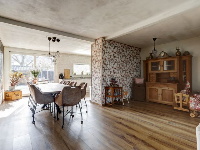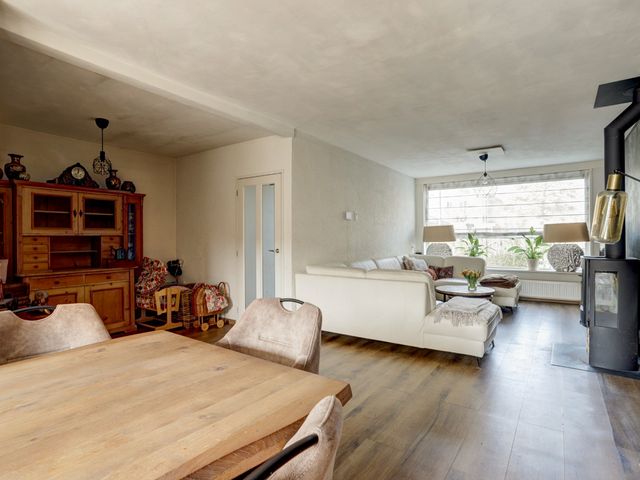 Deze 3,5 m uitgebouwde 6-kamer hoekwoning beschikt over een living van ca. 51m². Bestaande uit een zitkamer met houtkachel en een woonkeuken met een keukenblok in een U-vormige opstelling met diverse inbouwapparatuur. Via de kunststof schuifpui bereikt u de brede tuin op het zuiden met een riante houten schuur met overkapping.