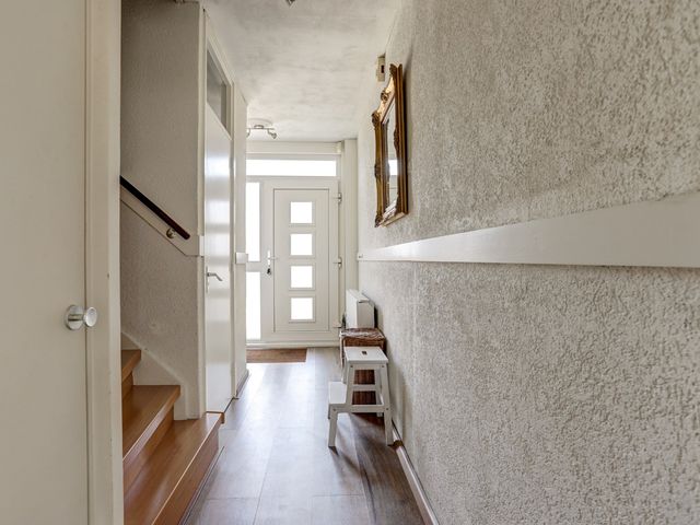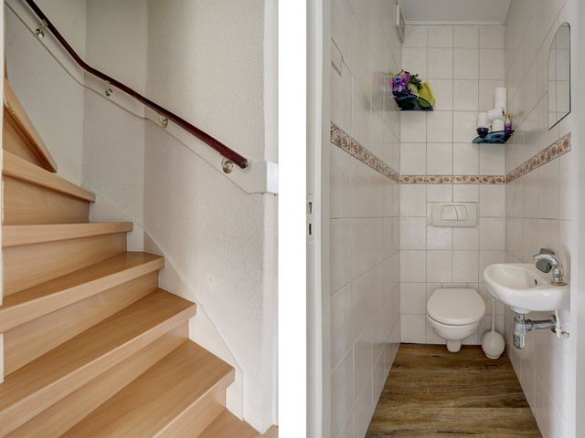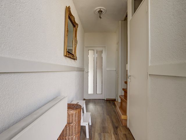 Via de voortuin bereikt u de entree van de woning. In de hal bevinden zich de meterkast, een vaste kast, de trapopgang naar de eerste verdieping en een volledig betegelde toiletruimte met wandcloset en fonteintje.