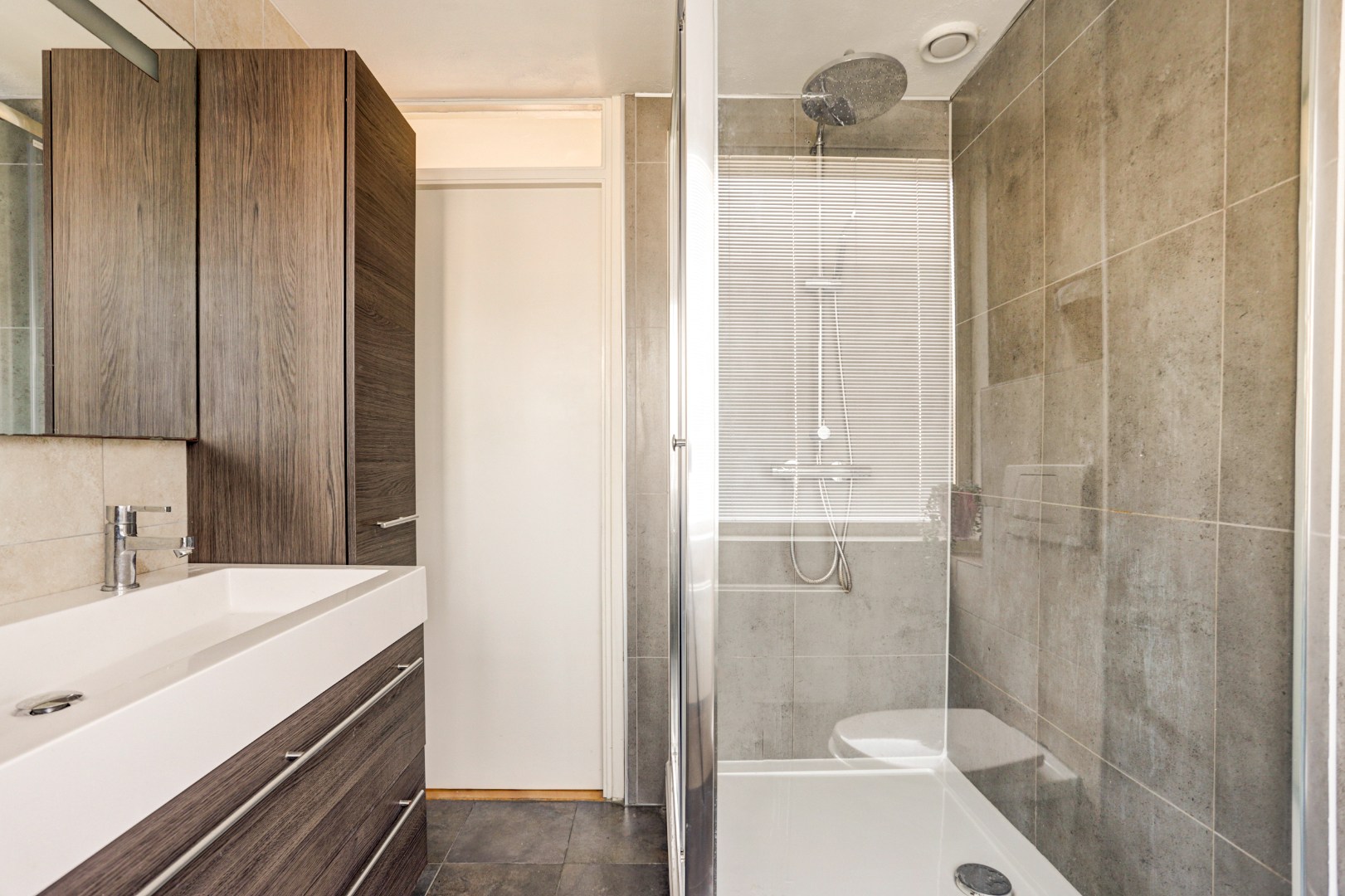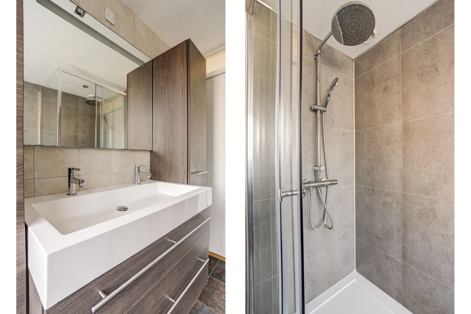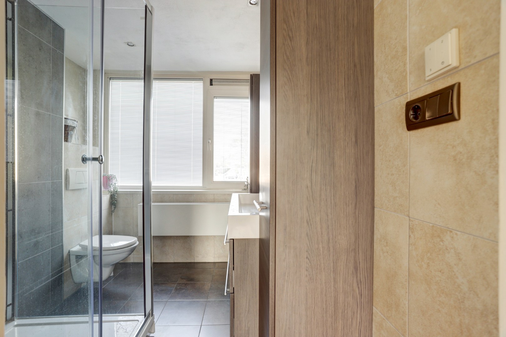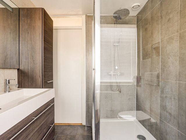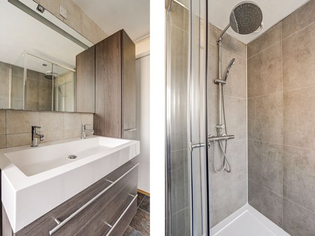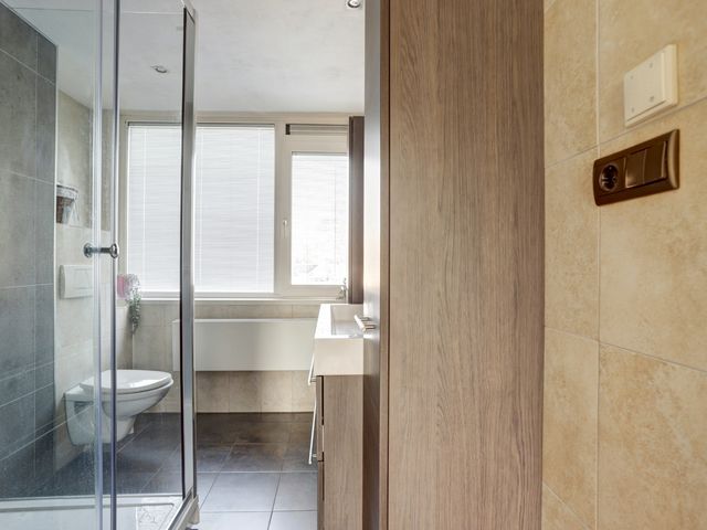 De moderne badkamer is volledig betegeld en uitgerust met een douchecabine met zowel een regen- als handdouche, een breed wastafelmeubel met dubbele kraan, een grote spiegel, een handdoekenkast en een tweede wandcloset.