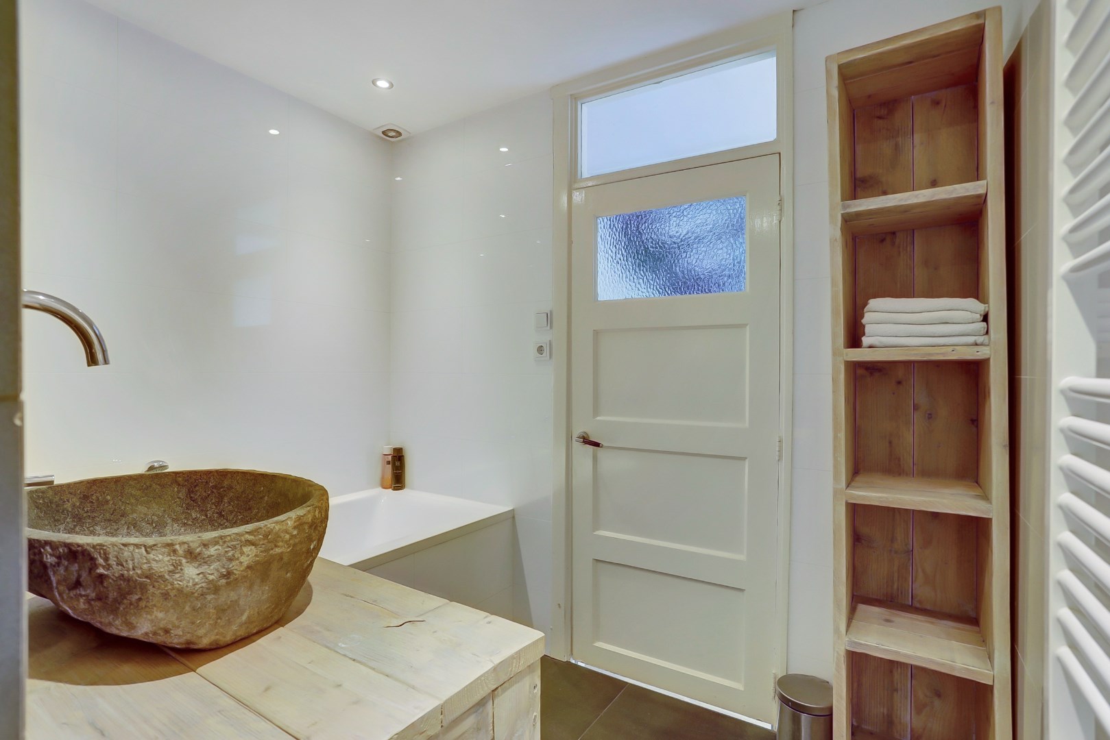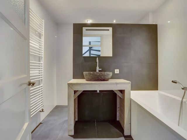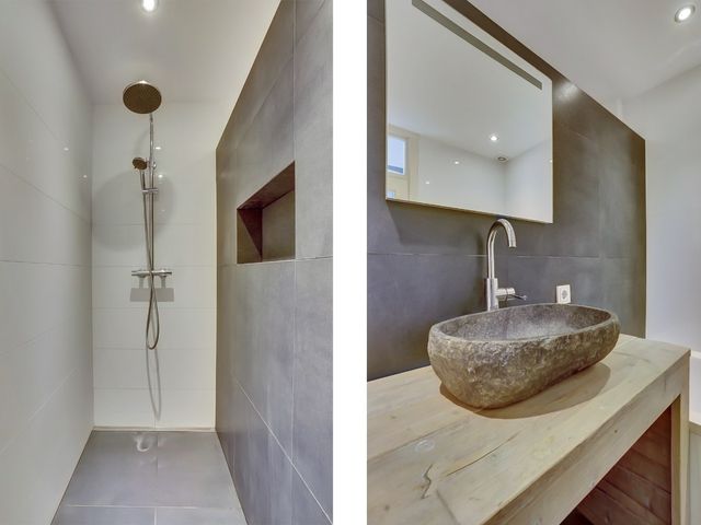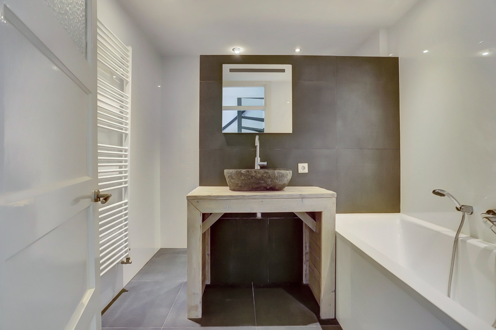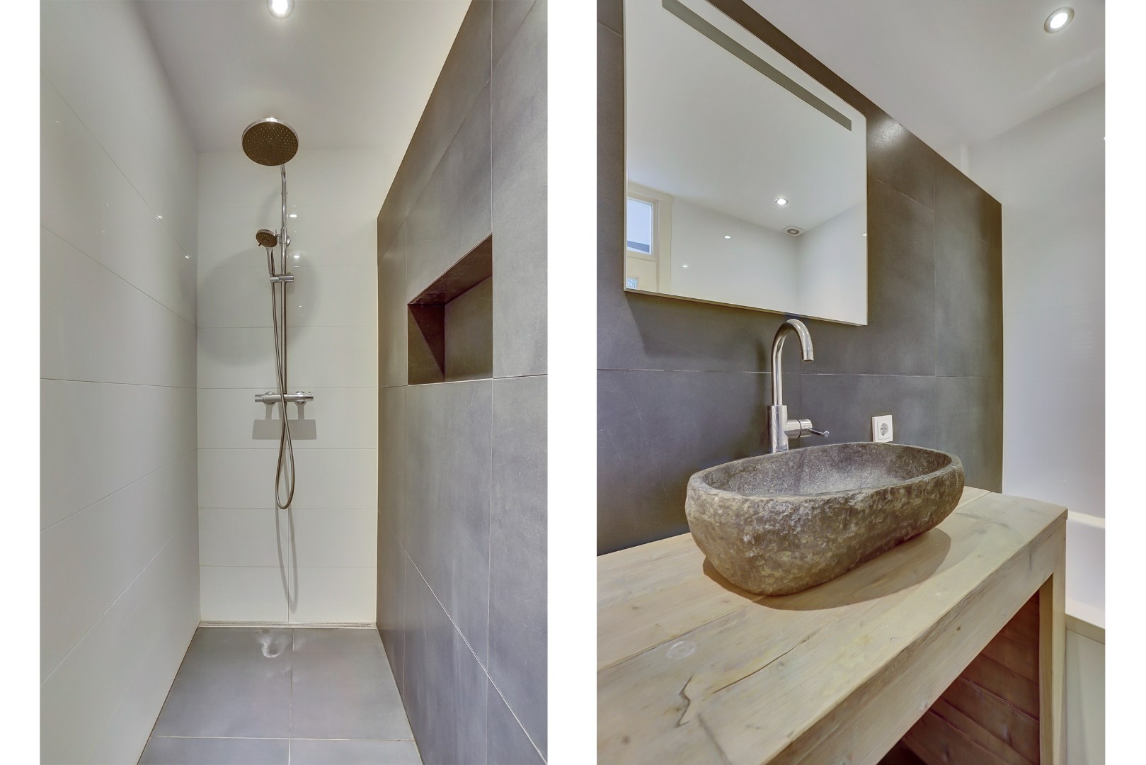 De moderne badkamer is luxe uitgevoerd met een ligbad met handdouche, een ruime inloopdouche met regendouche en een strak wastafelmeubel met spiegel.