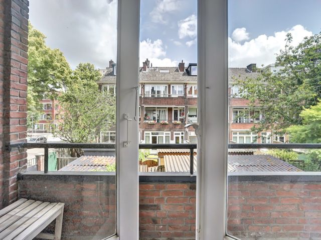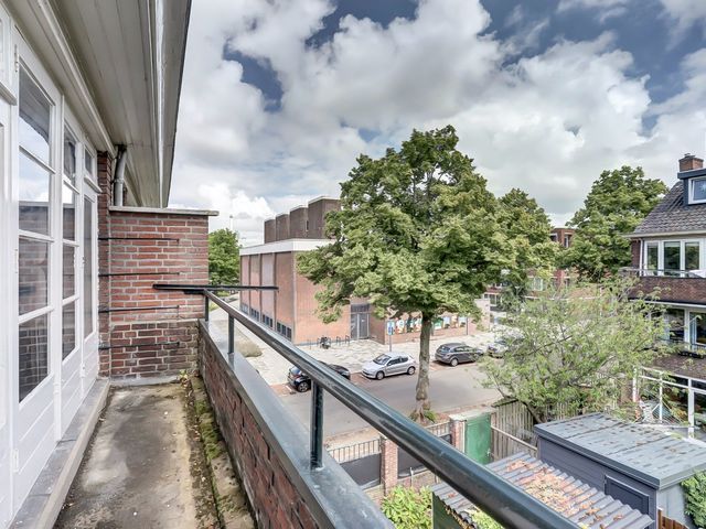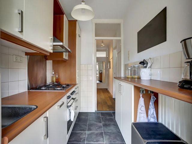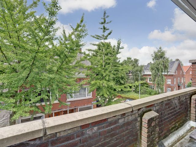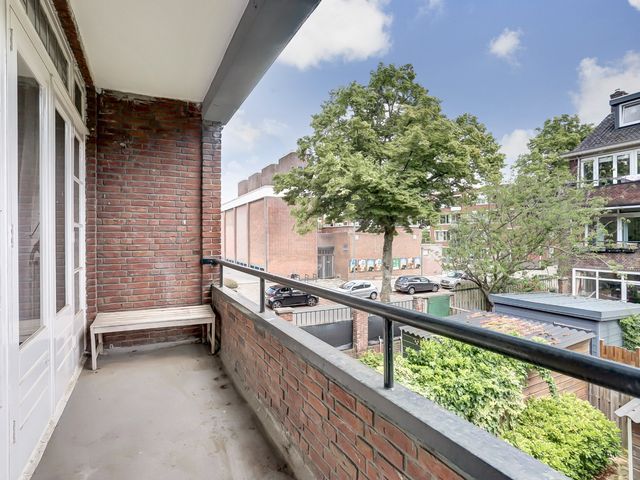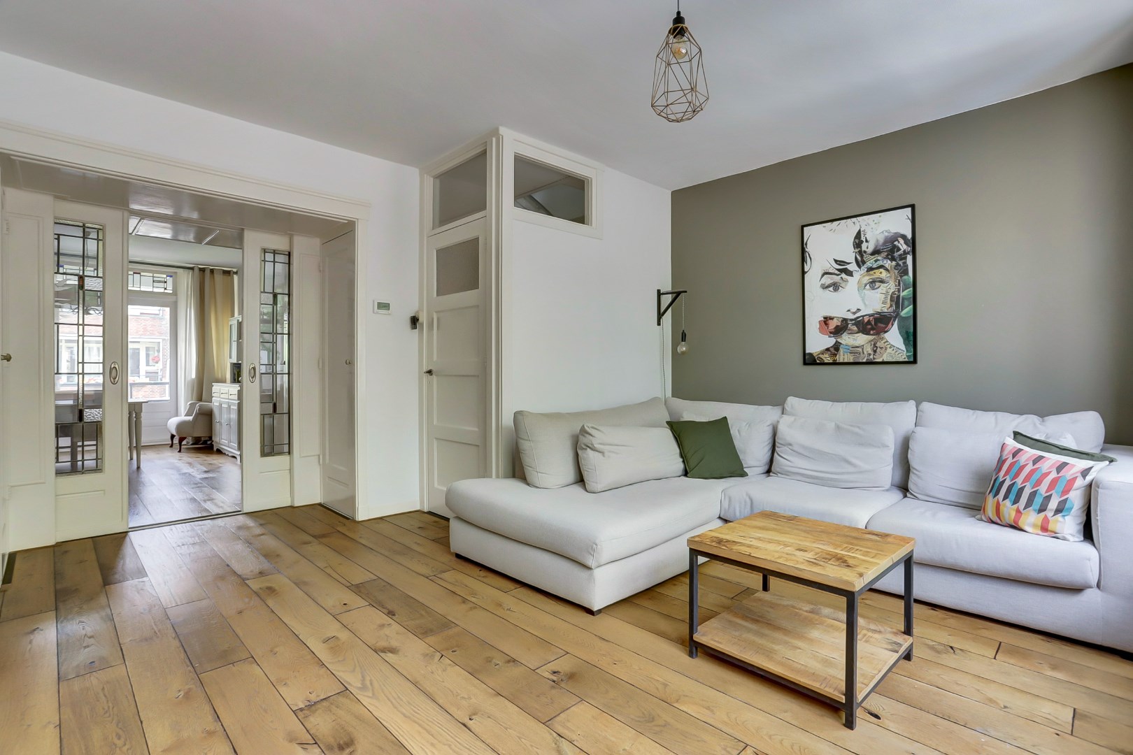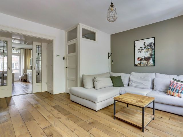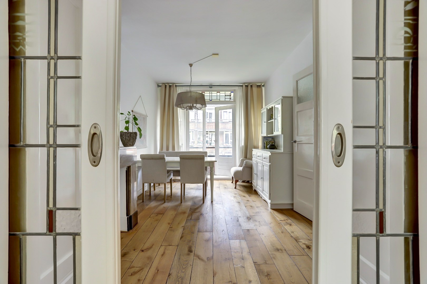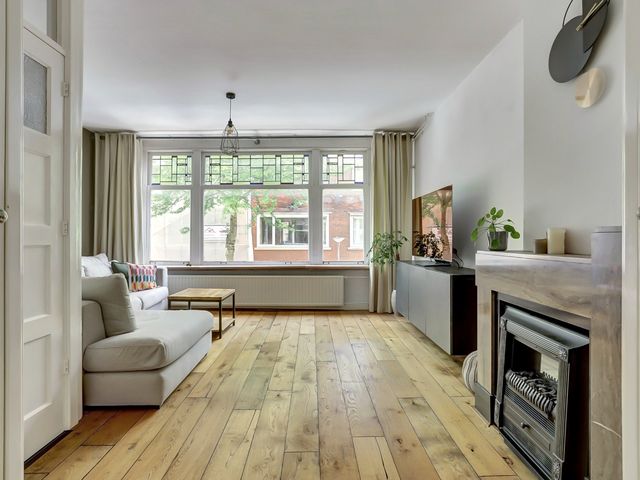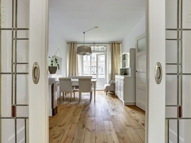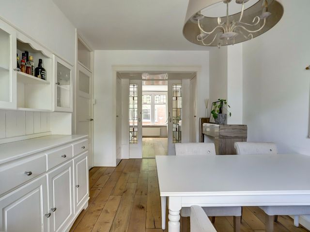 De woonkamer is een absolute eyecatcher: ruim, licht en sfeervol, met een prachtige houten vloer, meerdere vaste kasten, een stijlvolle marmeren schouw met haard en karaktervolle ensuite deuren met glas-in-lood. Via de authentieke schuifdeuren bereikt u de eetkamer, vanwaar u eveneens middels openslaande deuren toegang heeft tot het balkon aan de achterzijde.