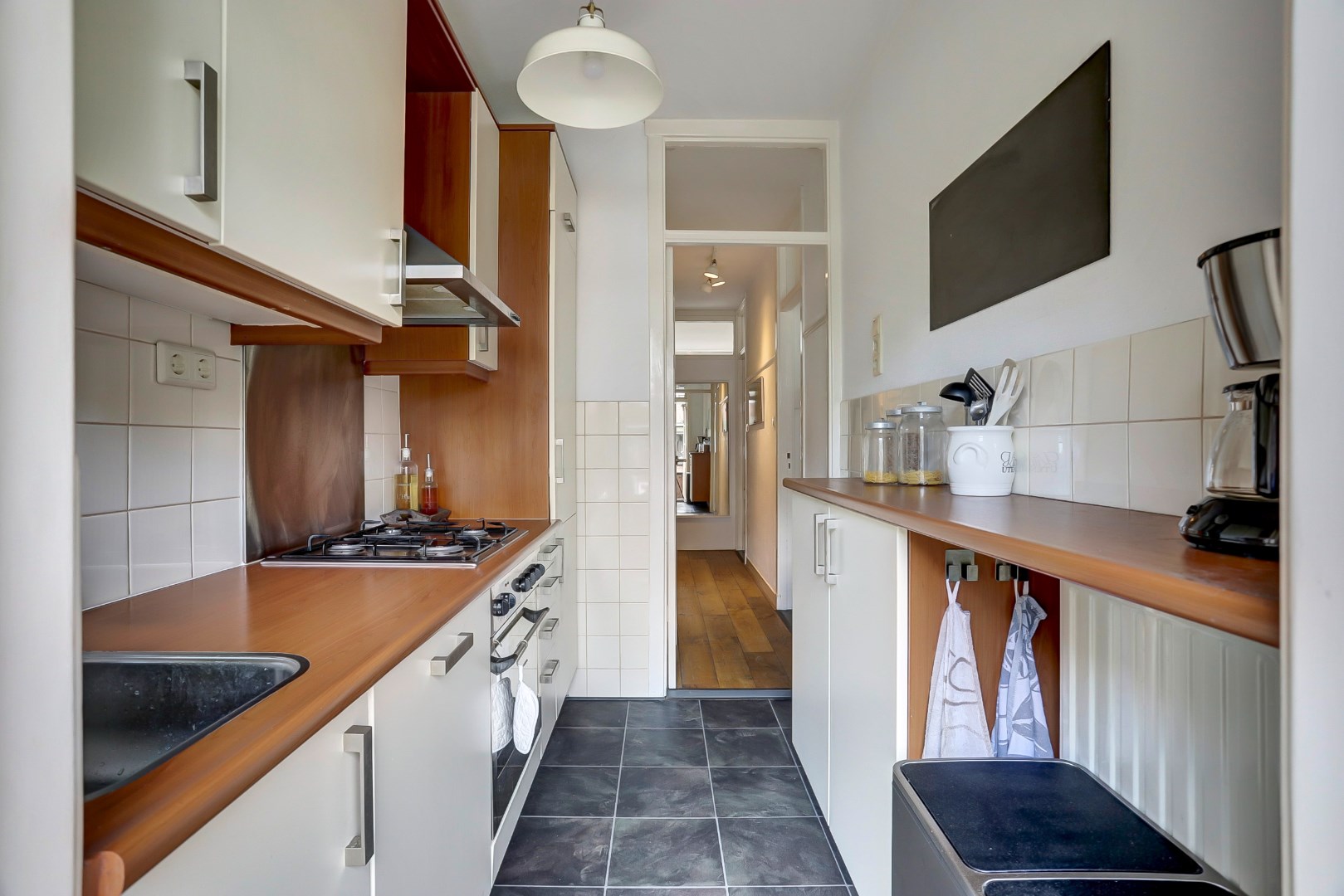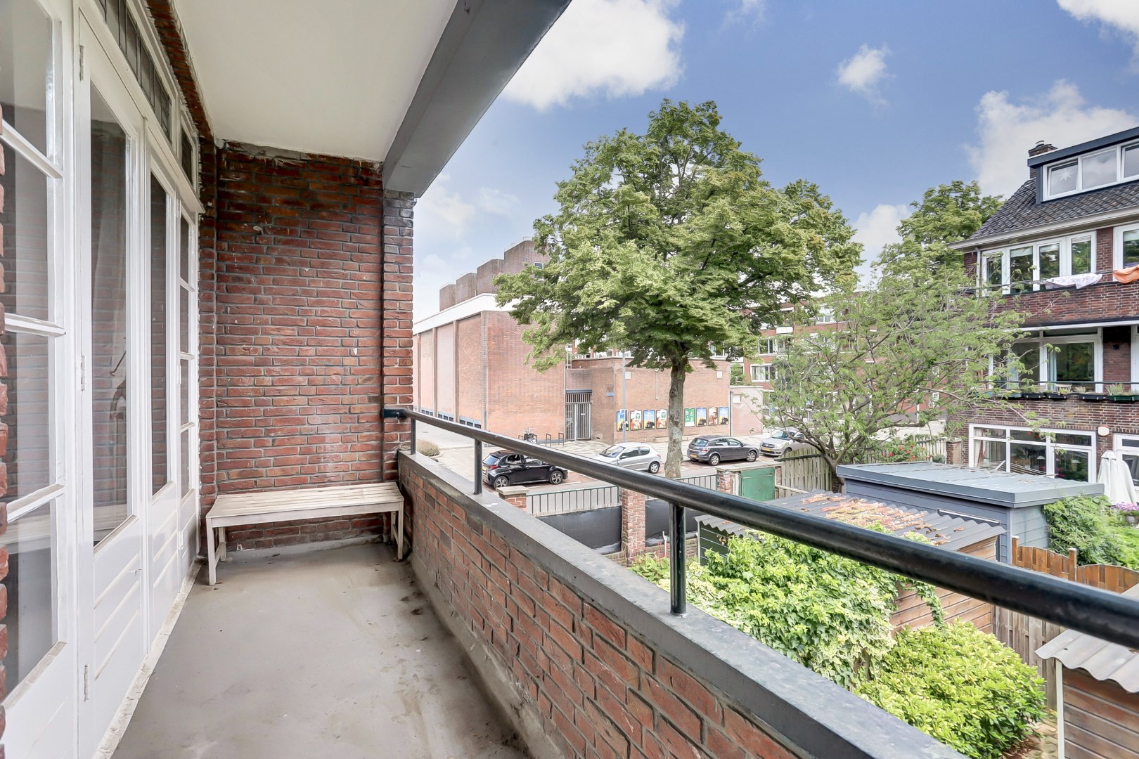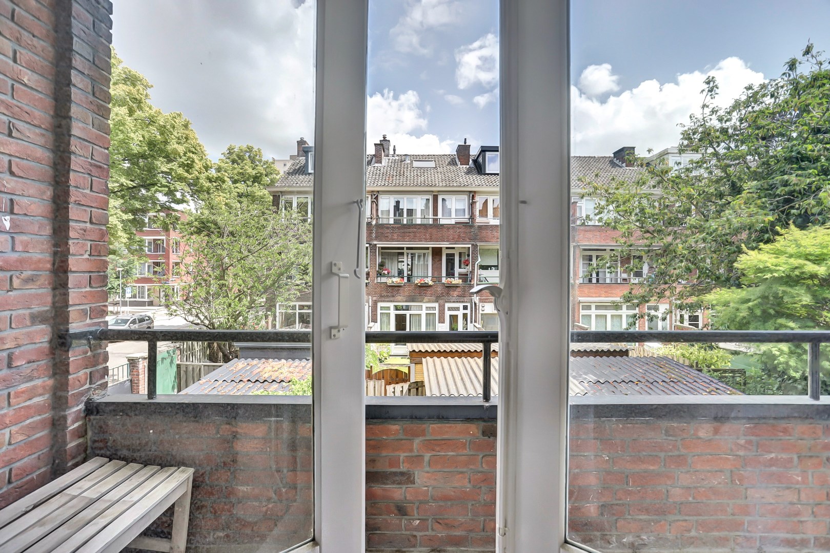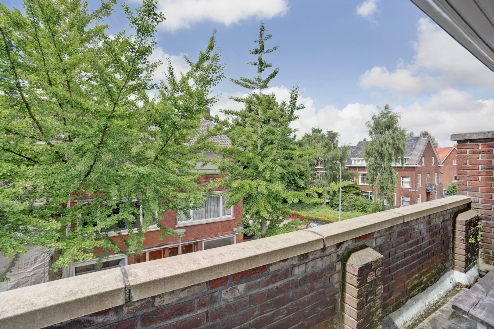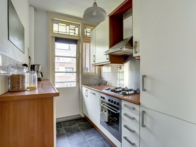 De woonkamer is een absolute eyecatcher: ruim, licht en sfeervol, met een prachtige houten vloer, meerdere vaste kasten, een stijlvolle marmeren schouw met haard en karaktervolle ensuite deuren met glas-in-lood. Via de authentieke schuifdeuren bereikt u de eetkamer, vanwaar u eveneens middels openslaande deuren toegang heeft tot het balkon aan de achterzijde.