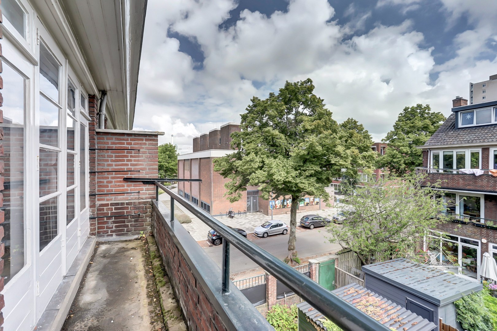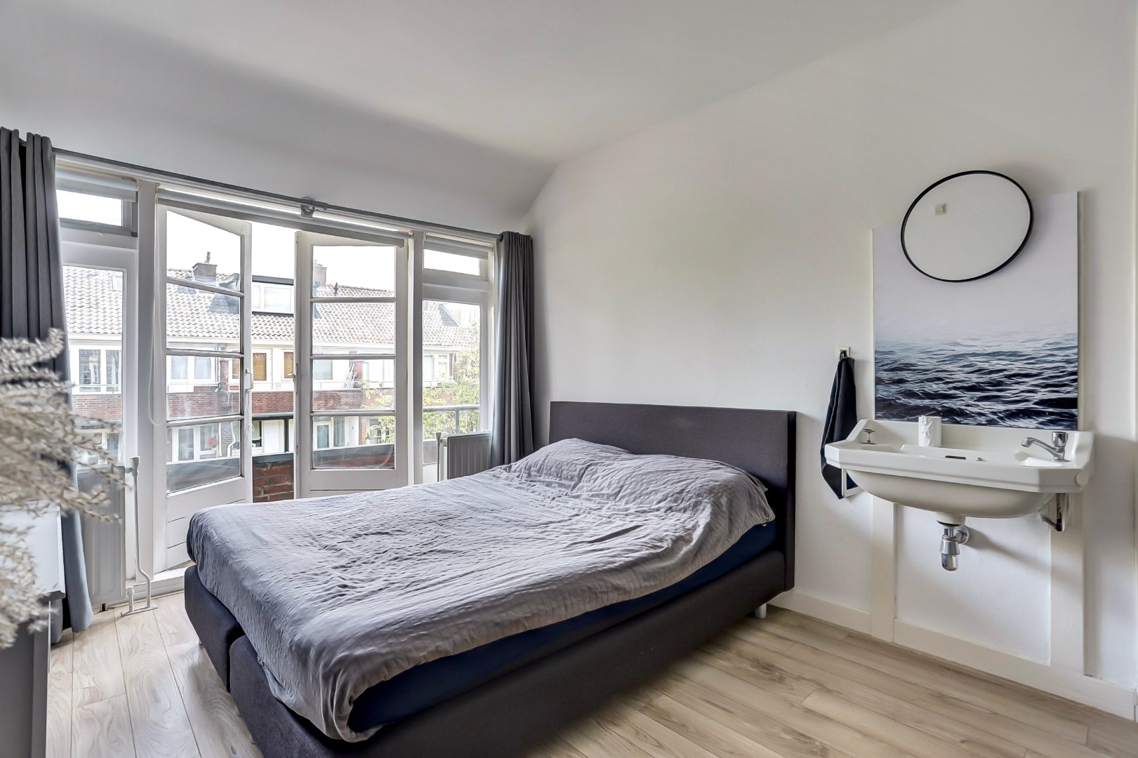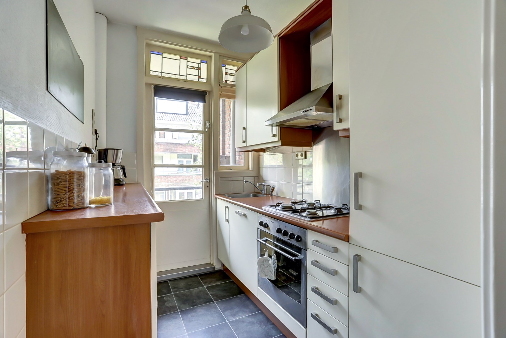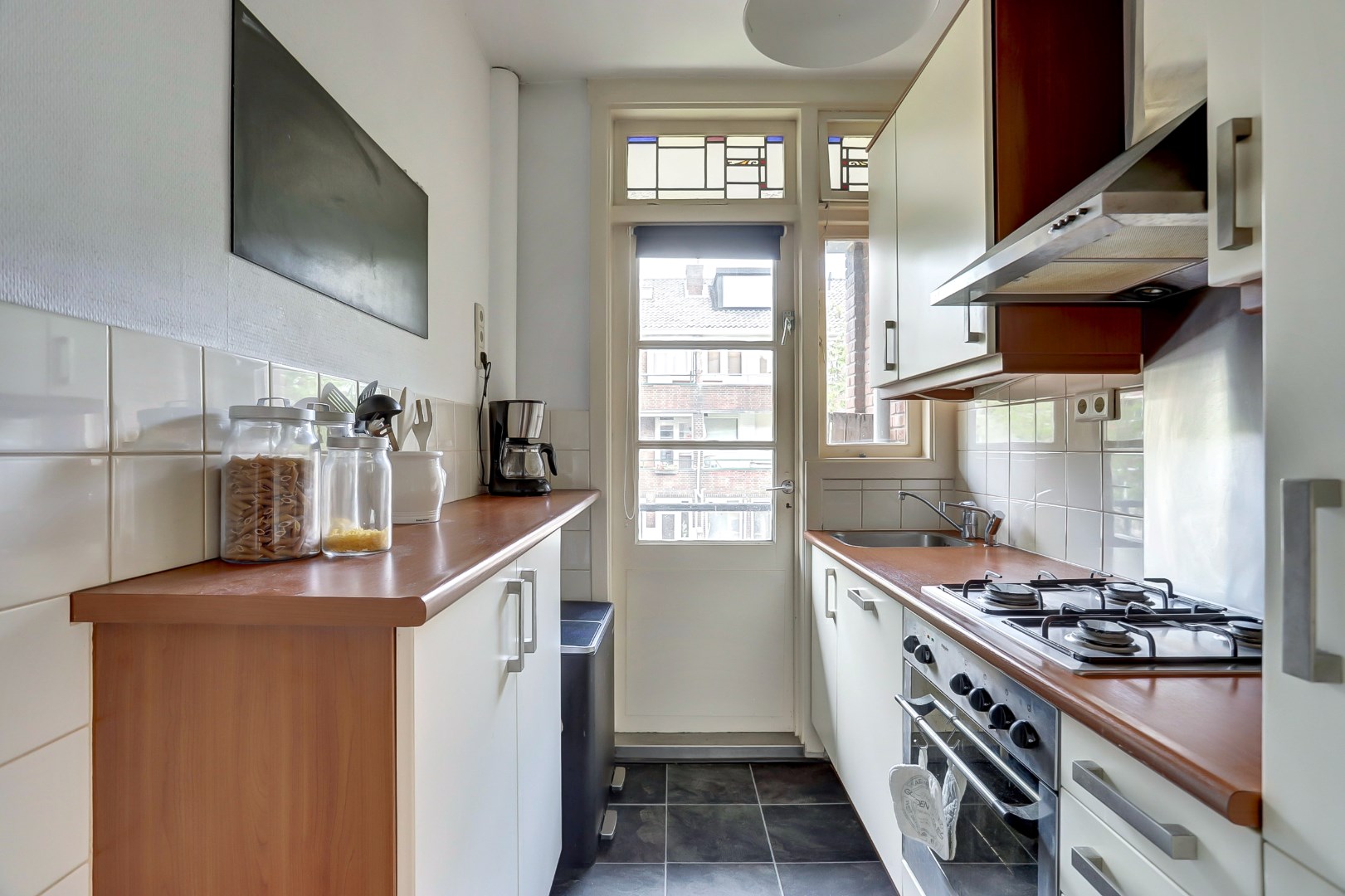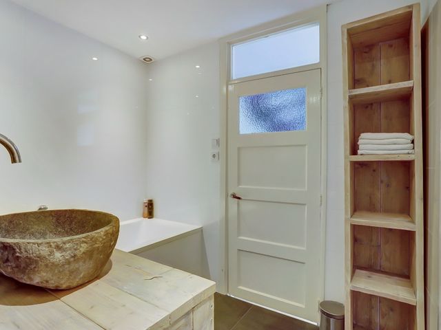 De woonkamer is een absolute eyecatcher: ruim, licht en sfeervol, met een prachtige houten vloer, meerdere vaste kasten, een stijlvolle marmeren schouw met haard en karaktervolle ensuite deuren met glas-in-lood. Via de authentieke schuifdeuren bereikt u de eetkamer, vanwaar u eveneens middels openslaande deuren toegang heeft tot het balkon aan de achterzijde.