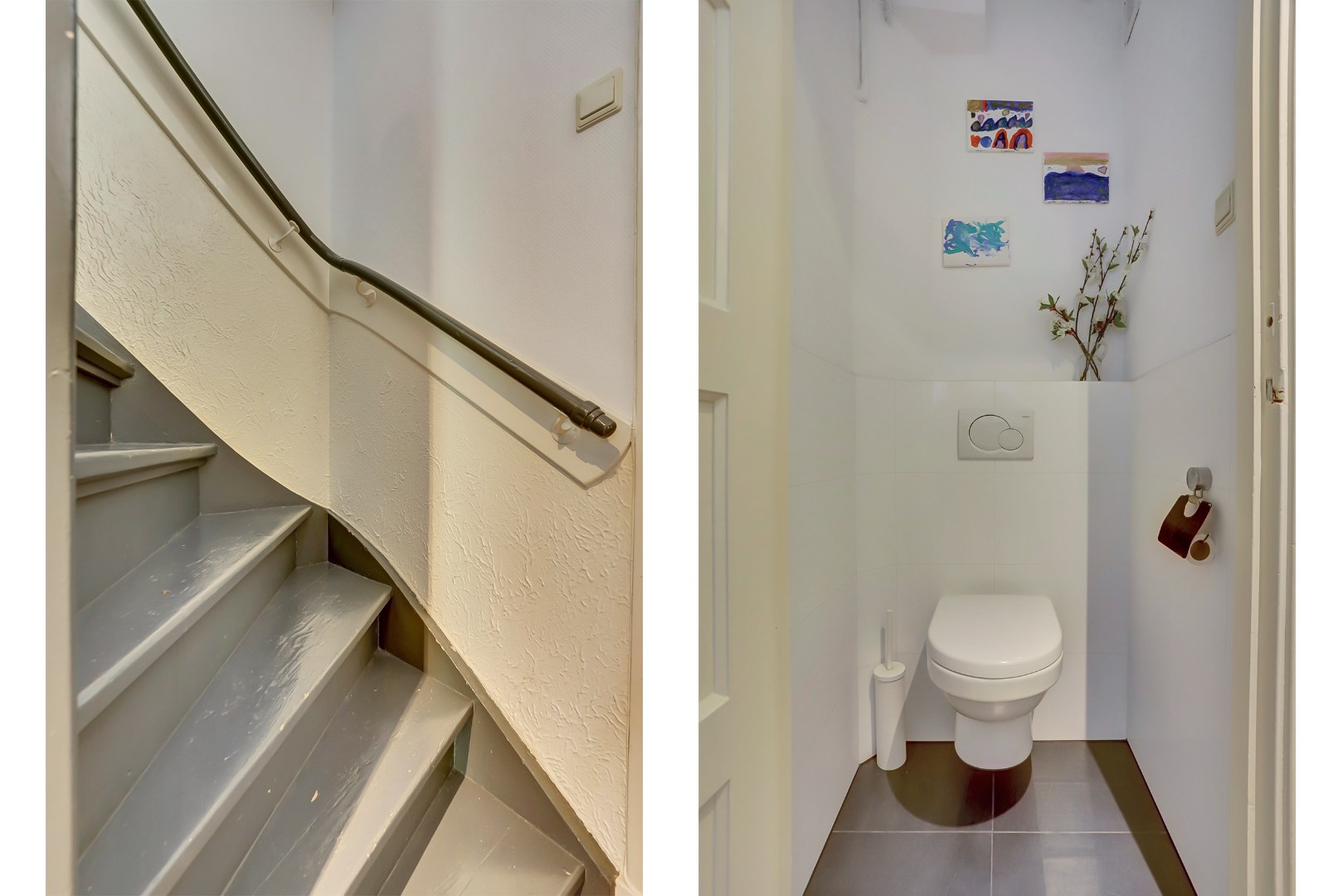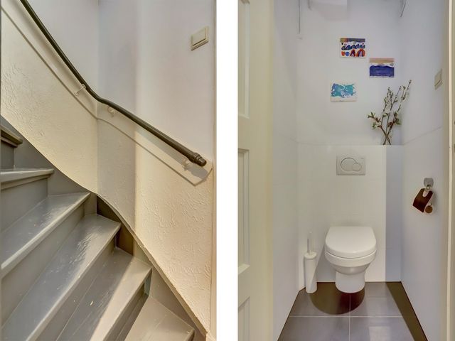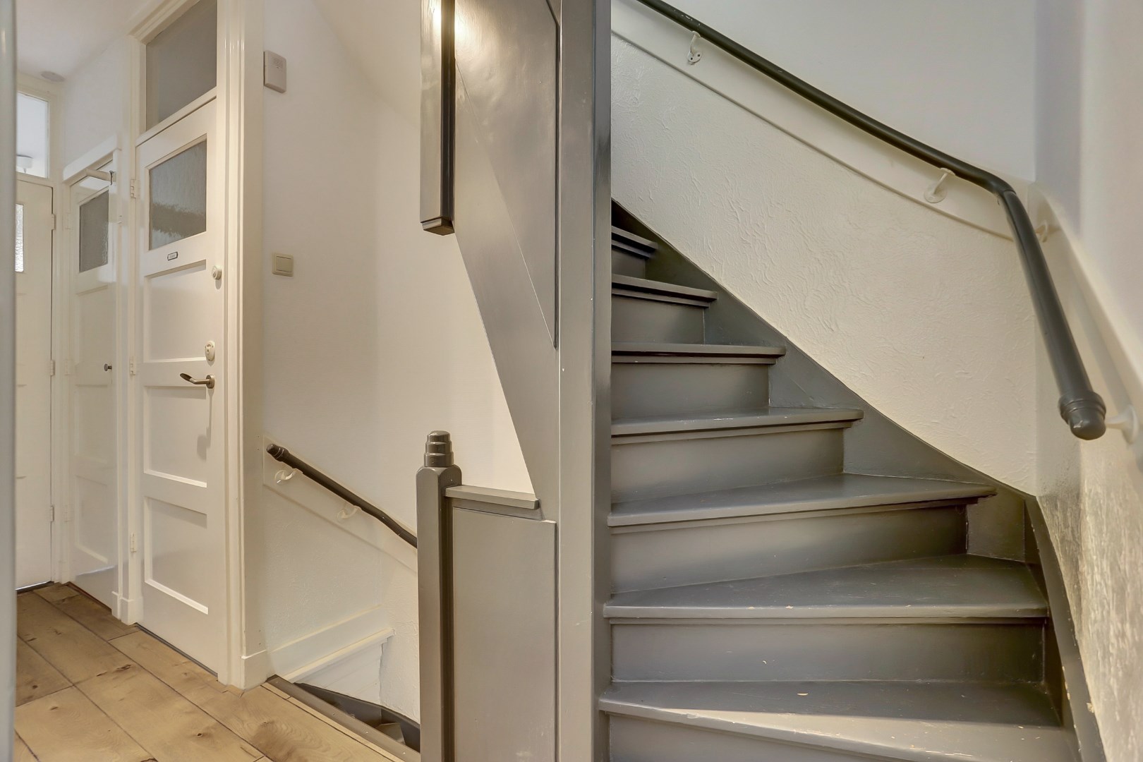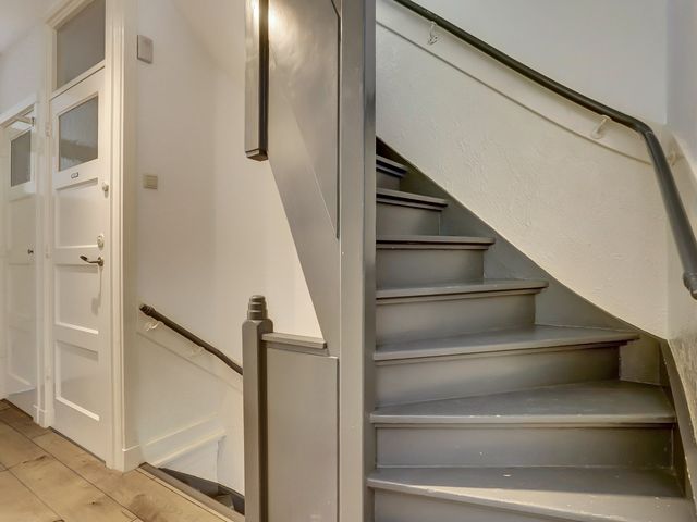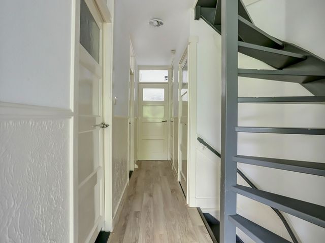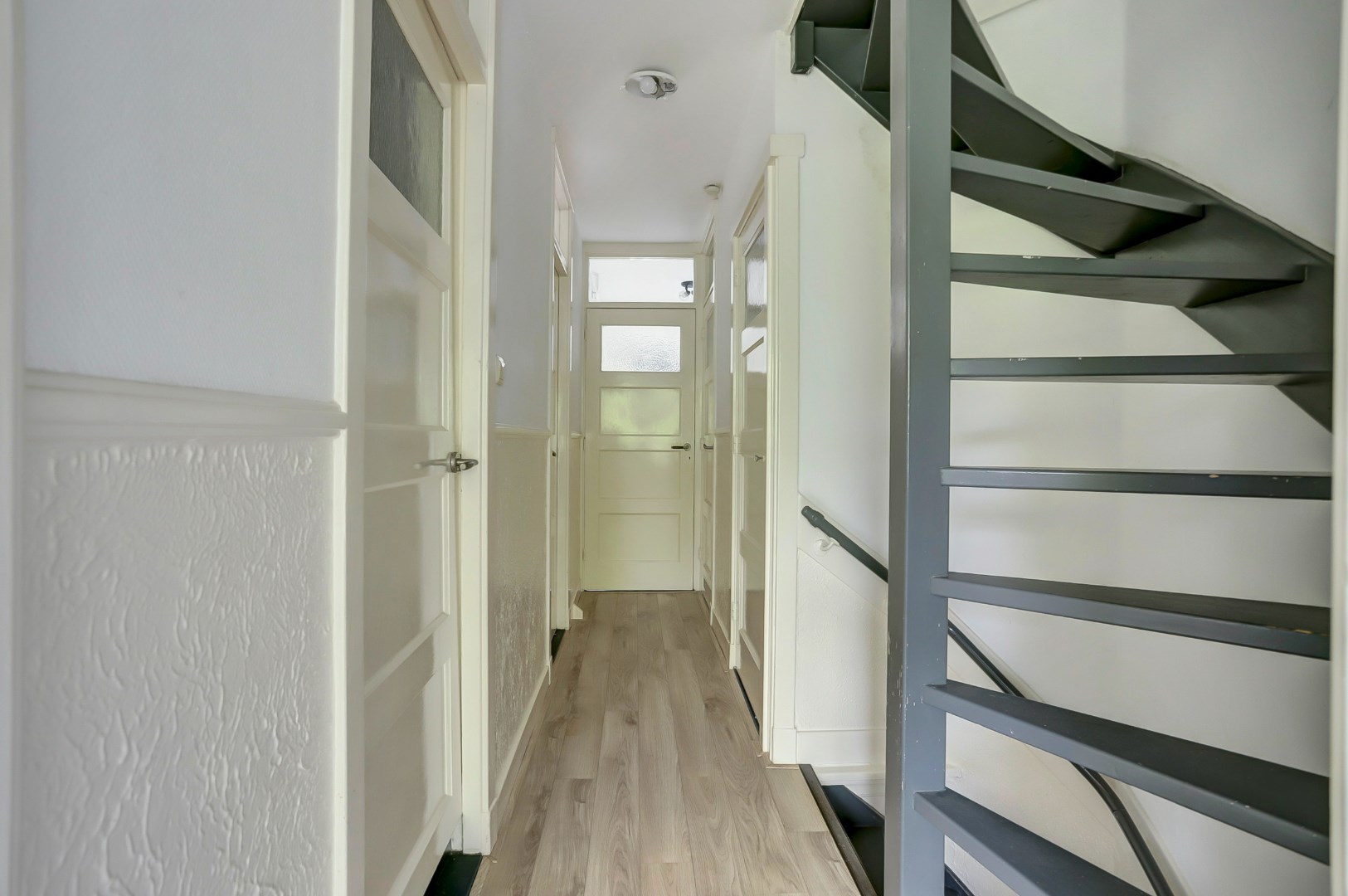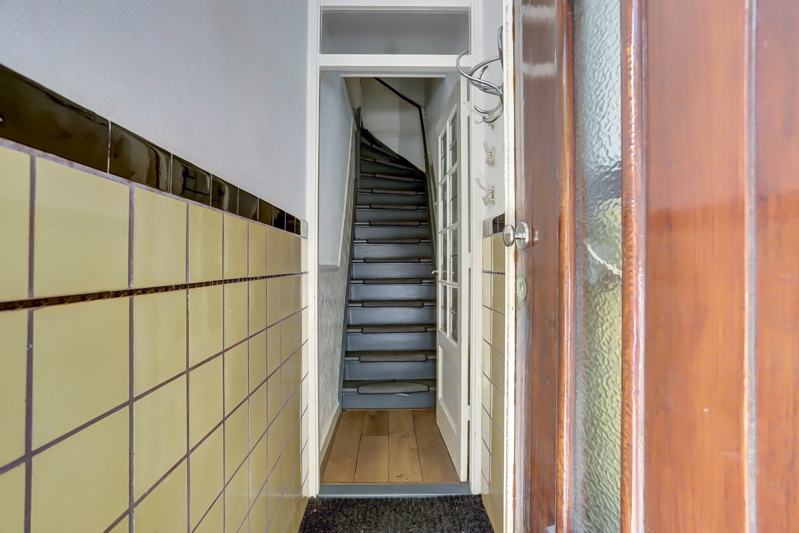 Eigen voordeur, hal met originele wandbetegeling en trapopgang naar de eerste verdieping. Achter het huis heeft u een aparte berging (2.92 x 1.50 x 2.33/2.23), te bereiken via de poort aan de achterzijde, handig voor fietsen en opslag.